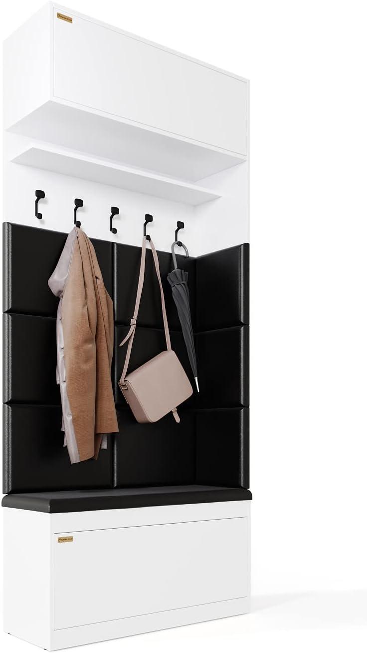 | Name | PLATAN ROOM Wand-Garderobe Set mit Garderobenpaneel & Schuhschrank & Hängeschrank 100 cm Flurgarderobe Garderobenset Flur Eiche Holz Weiß (Weiß, 4-TLG. mit 10 paneel) |