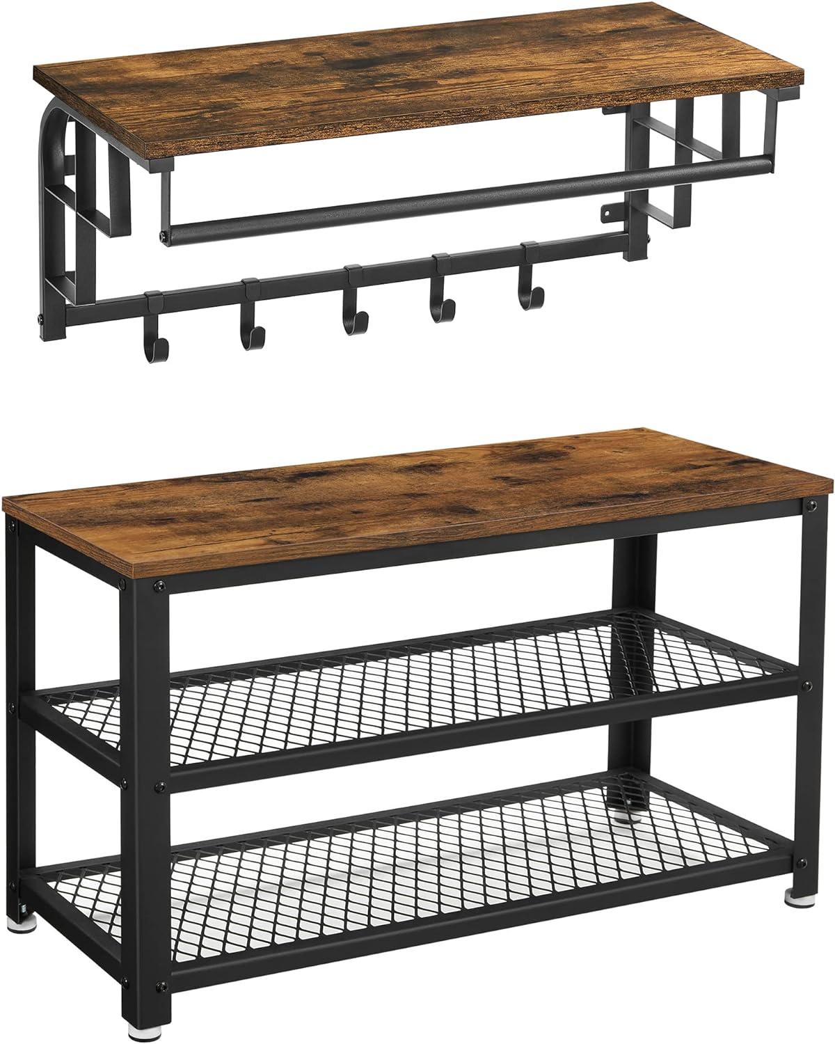 | Name | VASAGLE Schuhbank, Wandgarderobe, Schuhregal mit Sitzfläche und 2 Ablagen, Wandregal mit Kleiderstange und 5 abnehmbaren Haken, für Flur, Schlafzimmer, Wohnzimmer, vintagebraun-schwarz LCR100B01 |