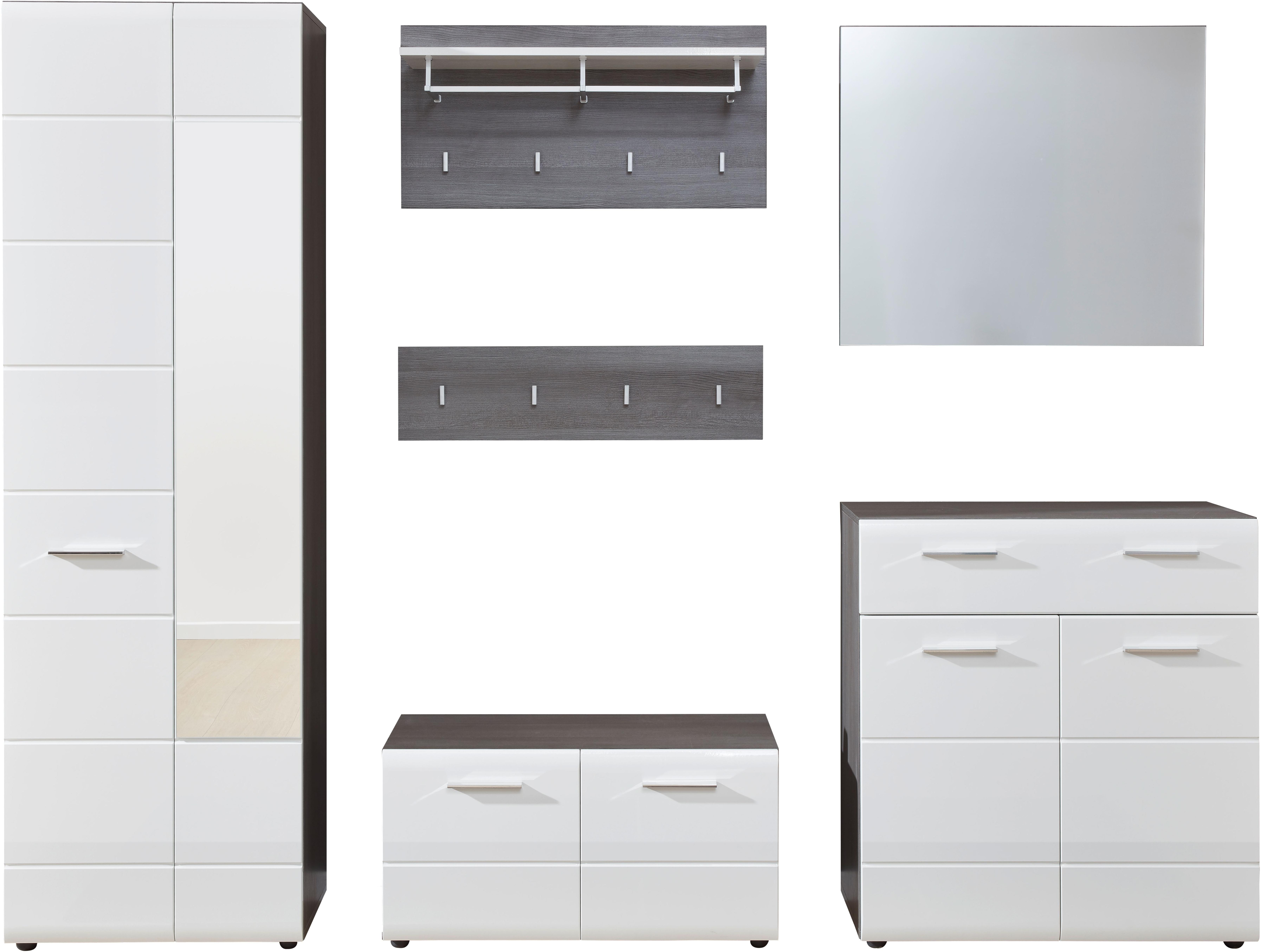 | Set-Bestandteile | 1 Garderobenschrank, 1 Garderobenpaneel, 1 Garderobenleiste, 1 Sitzbank, 1 Garderobenspiegel, 1 Kommode/Schuhschrank |