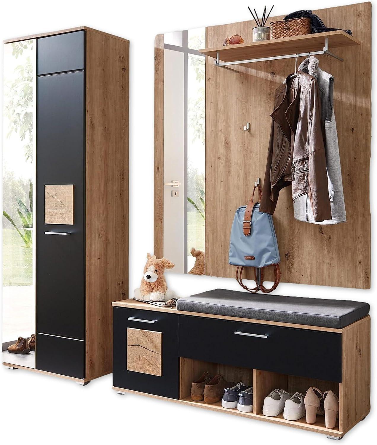 | Name | FUN Flurgarderoben Set in Schwarz, Artisan Eiche Optik mit Hirnholz-Applikationen - Modernes Garderobenset 3-teilig für Ihren Eingangsbereich - 206 x 195 x 38 cm (B/H/T) |