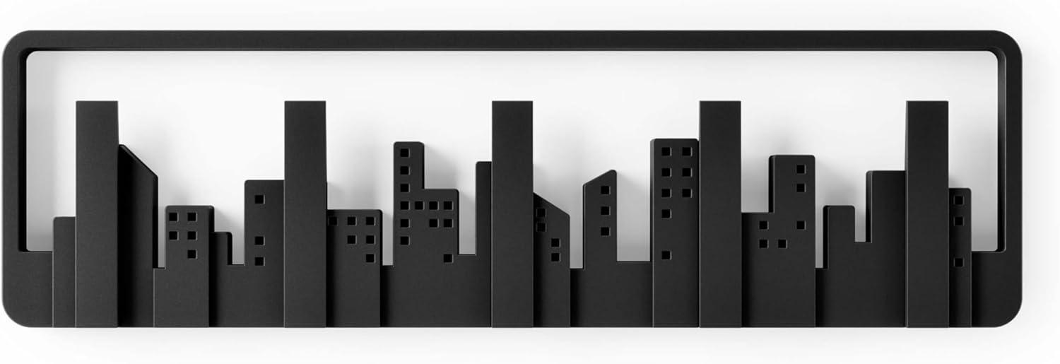 Die Umbra Skyline Schwarz Garderobenhaken mit 5 beweglichen Haken sind eine moderne Wandgarderobe, die von der Skyline New Yorks inspiriert ist. Die Garderobe verfügt über 5 klappbare Haken, die jeweils bis zu 2,3 kg belastbar sind. Mit ihrem dekorativen und funktionalen Design ist sie ein echter Hingucker für jeden Flur oder jede Garderobe. Die Montage ist einfach und das benötigte Befestigungsmaterial ist bereits im Lieferumfang enthalten. Die Garderobe ist aus strapazierfähigem ABS-Kunststoff gefertigt und hat die Maße 50 x 15 x 3 cm. Sie wiegt 730 g. **Highlights** - Inspiriert von der Skyline New Yorks - 5 klappbare Haken in Form von Hochhäusern - Belastbarkeit von bis zu 2,3 kg pro Haken - Dekoratives und funktionales Design - Einfache Montage, Befestigungsmaterial im Lieferumfang enthalten **Produkteigenschaften** - Farbe: Schwarz - Befestigungsart: Wandmontage - Material: ABS-Kunststoff - Maße: 50 x 15 x 3 cm - Gewicht: 730 g **Lieferumfang** - Umbra Skyline Schwarz Garderobenhaken - Montagezubehör