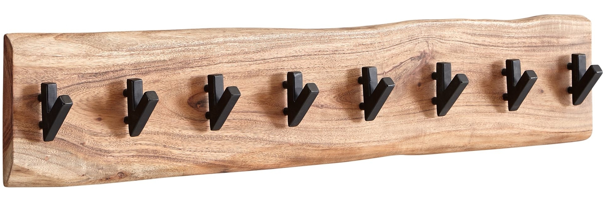 Die Wohnling Wandgarderobe vereint ein ausdrucksstarkes Design aus Holz und Metall mit hoher Funktionalität. Mit acht massiven Haken bietet sie ausreichend Platz für Jacken und Mäntel. Die natürliche Baumkante sorgt für ein individuelles Aussehen. Die Garderobe hat eine Breite von 90 cm, eine Höhe von 19 cm und eine Tiefe von 9 cm. Die Rückwand besteht aus braunem Akazien-Massivholz, während die Haken aus pulverbeschichtetem Eisen gefertigt sind. Die maximale Belastbarkeit beträgt 6 kg. **Highlights** - Ausdrucksstarkes Design aus Holz und Metall - Natürliche Baumkante für individuelles Aussehen - Acht massive Haken für Jacken und Mäntel - Handgefertigt als Unikat - Maximale Belastbarkeit: 6 kg **Produkteigenschaften** - Abmessungen: B90 cm x H19 cm x T9 cm - Materialstärke Holz: 2,5 cm, Metall: 1,5 cm - Farbe: Rückwand Braun, Haken Schwarz - Material: Rückwand aus Akazie Massivholz, mit Klarlack beschichtet; Haken aus pulverbeschichtetem Eisen **Lieferumfang** - 1x Wandgarderobe ohne Dekoration - Montagematerial für die Wandbefestigung nicht enthalten, da abhängig von der Wandbeschaffenheit