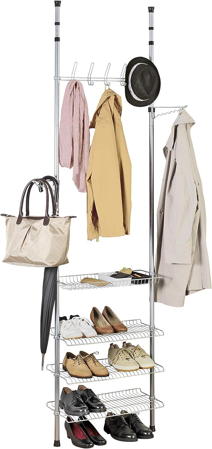 * Hochwertiges Garderobensystem mit höhenverstellbaren Teleskopstangen (180-300 cm) * Befestigen ohne Bohren, einfach zwischen Boden und Decke klemmen * Montage der Elemente in beliebiger Höhe * Inklusive 3 Schuhablagen, 5 Doppelhaken für Garderobe & 1 Körbchen für Accessoires * Tragkraft bis 25 kg * pulverbeschichtetes Metall * Maße - Höhe: 180-300 cm, Länge: 61 cm, Breite: 28 cm