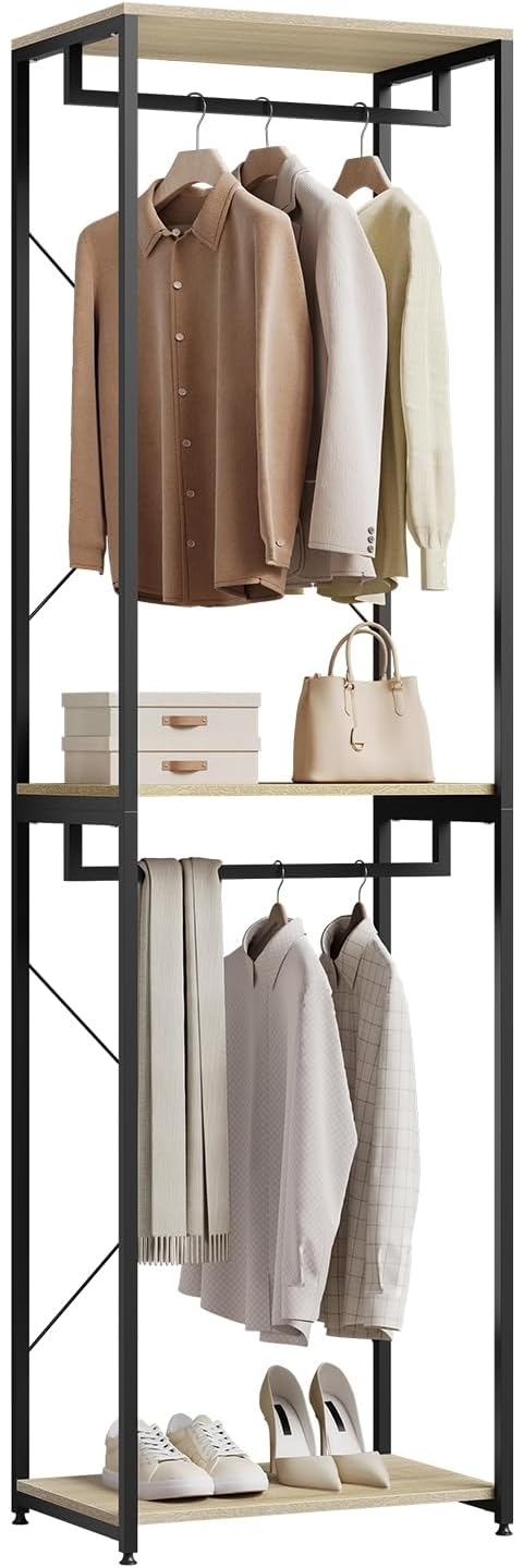 Der Woltu Kleiderständer in Schwarz und Helleiche bietet eine praktische Lösung zur Aufbewahrung Ihrer Garderobe. Mit einem maßstabgerechten Design und einer Höhe von ca. 213 cm ist er ideal für jeden Raum. Die zwei Kleiderstangen und vier großzügigen Ablagen sorgen dafür, dass Ihre Kleidung, Schuhe und Taschen stets griffbereit sind. Hergestellt aus stabilem Stahlrohr und Holz, überzeugt er durch seine Belastbarkeit von bis zu 20 kg für die Kleiderstangen und 10 kg für jedes kleine Fach. **Highlights** * Einfache Montage, leichte Bewegung * Perfekt maßstabgerechtes Design, spart Raum * Vier großzügige Ablagen für Schuhe oder Taschen * Abnehmbare zentrale Stange zum Aufhängen der Kleider * Aus stabilem, schwarz lackiertem Stahlrohr gefertigt **Produkteigenschaften** * Farbe: schwarze Metallrohre / Eiche hell * Anzahl der Kleiderstangen: 2 * Maße: ca. 60 x 40 x 213 cm (L x T x H) * Material: Stahlrohr und Holz * Belastbarkeit der Kleiderstange: 20 kg * Belastbarkeit jedes kleinen Faches: 10 kg