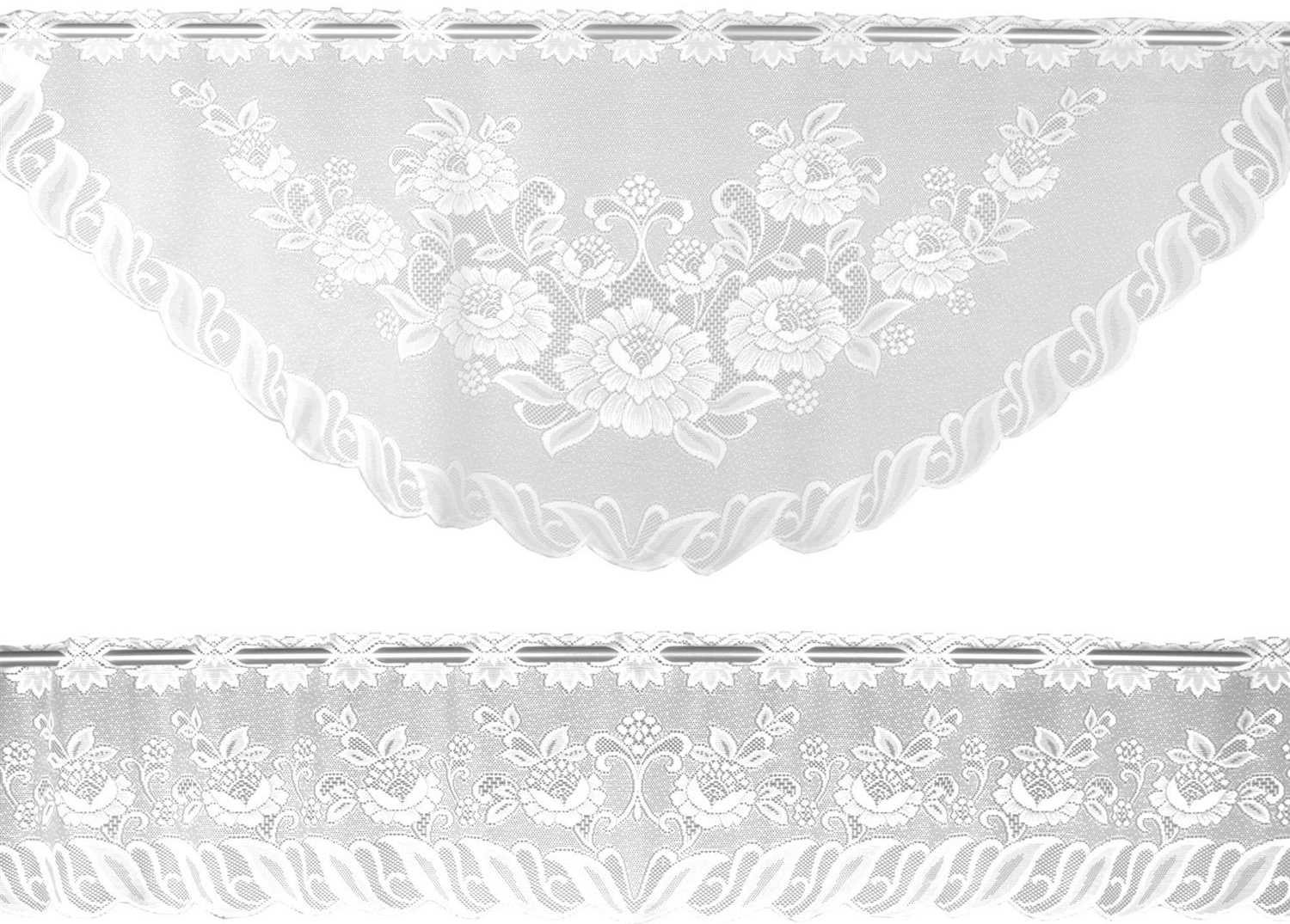 Das Arsvita Bistrogardinen-Set besteht aus zwei stilvollen Scheibengardinen im wunderschönen Blumenmuster. Mit den Maßen 160x60 cm für den oberen Fensterteil und 160x30 cm für den unteren Teil sind sie die perfekte Dekoration für Ihre Fenster. Die pflegeleichten Vorhänge aus Polyester schützen vor Blicken von außen und ermöglichen gleichzeitig eine tolle Sicht nach draußen. Sie sind fensterfertig konfektioniert und lassen sich einfach aufhängen. **Highlights** - Wunderschönes Blumenmuster - Pflegeleichtes Material aus Polyester - Maschinenwaschbar bei 30°C - Fensterfertig konfektioniert - Einfacher Stangendurchzug für die Aufhängung **Produkteigenschaften** - Maße (BxL): 160x60 cm (oberer Teil), 160x30 cm (unterer Teil) - Farbe: Weiß **Lieferumfang** - 2x Bistrogardinen (1 x 160 x 60 cm, 1 x 160 x 30 cm) - Ausschluss von Vitragestange oder Caféhausstange