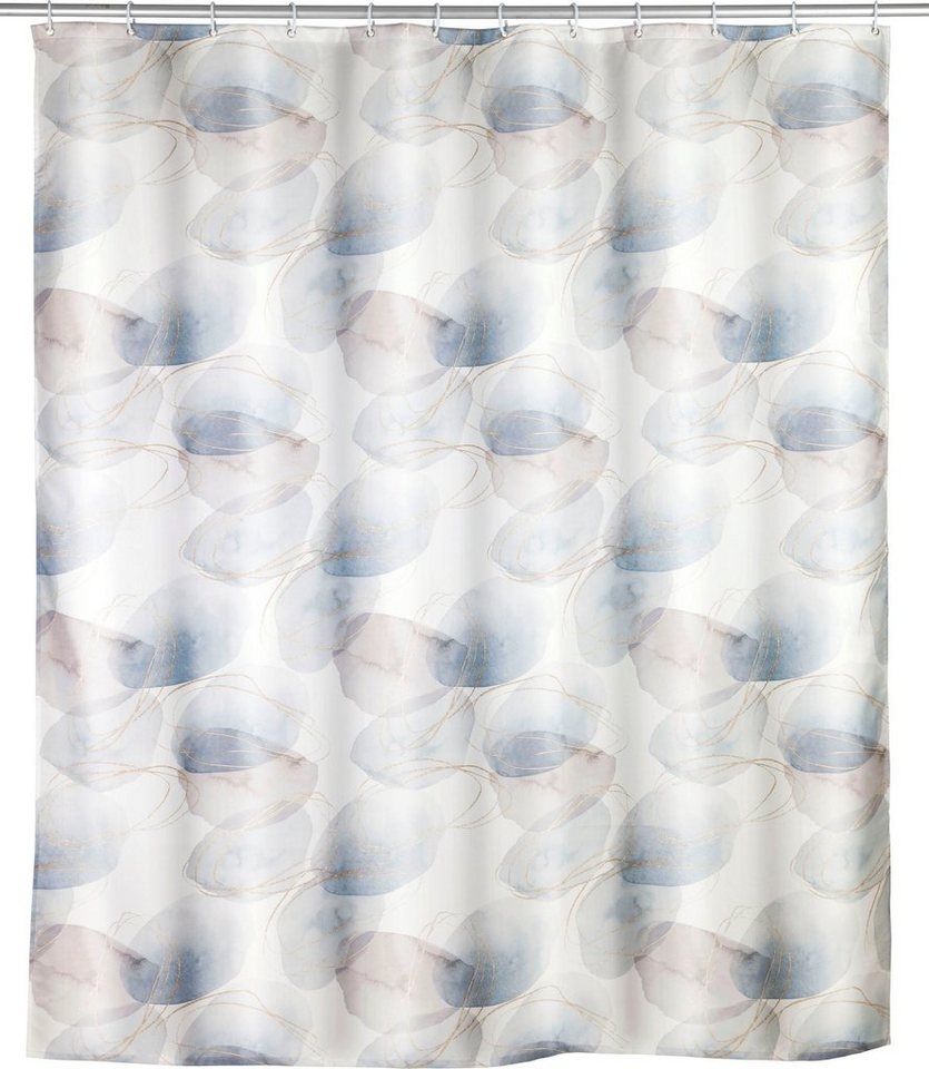 Beschreibung Der WENKO Duschvorhang Navan kombiniert Hygiene und modernes Design. Mit einer Breite von 180 cm und einer Höhe von 200 cm eignet er sich ideal für Dusche und Badewanne. Der Duschvorhang ist antibakteriell beschichtet und verfügt über einen sensationellen Anti-Schimmel-Effekt. Das ansprechende Design mit überlappenden runden Flecken in Grau und Blau sowie goldener Metallic-Optik fügt sich harmonisch in Ihr Badezimmer ein. Hergestellt aus haltbarem Polyester, ist er pflegeleicht und bei 30 °C waschbar. **Highlights** - Anti-Schimmel-Effekt: Verhindert Schimmelbildung und sorgt für Hygiene. - Antibakterielle Beschichtung: Schützt vor Bakterien und sorgt für ein sauberes Gefühl. - Wasserabweisender Effekt: Feuchtigkeit perlt ab und trocknet schneller. - Modernes Design: Überlappende runde Flecken in Grau und Blau mit goldener Metallic-Optik. - EU-patentiert: Garantierte Qualität und Innovation. **Produkteigenschaften** - Maße (BxH): 180x200 cm - Material: Polyester - Pflegeleicht: Waschbar bei 30 °C - Verstärkte Lochleiste mit rostfreien Metallösen - Gewichtsband aus Gummi am unteren Ende **Lieferumfang** - 1 Duschvorhang - 12 Duschvorhangringe aus Kunststoff