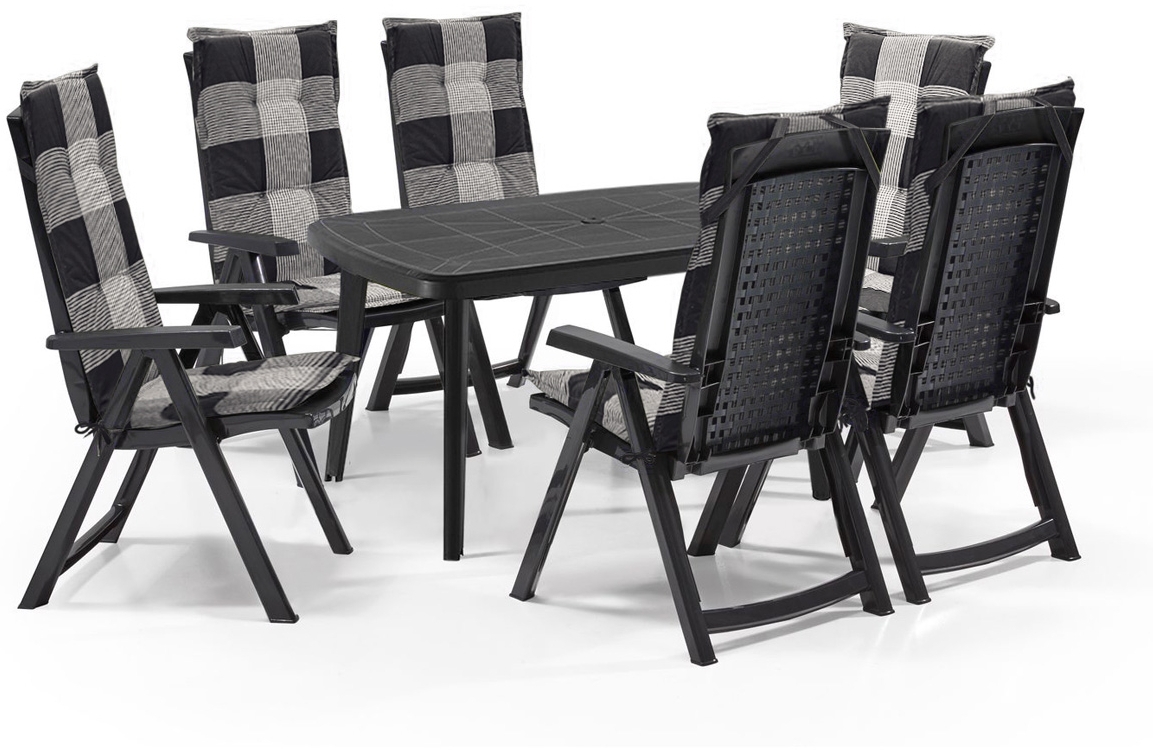 in Garten-EssgruppenShaf Milano 7-tlg. Outdoor-Essgruppen-Set | Klappstuhl anthrazit | mit karierten Polstern | Wetterfest | Klappsessel