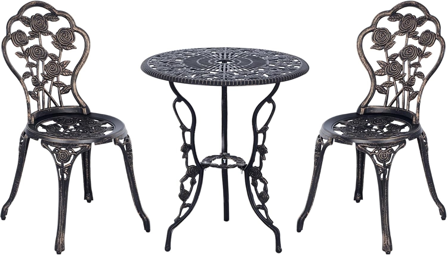 Dieses dekorative Gartenmöbelset im nostalgischen Vintage-Design passt perfekt in Ihren Garten, auf Ihre Terrasse oder in Ihre Wohnung. Das lebendige Gussrosenmuster auf Tisch und Stühlen macht das Bistroset zum charaktervollen Blickfang auf Ihrer Terrasse. Tisch und Stühle bestehen aus einem langlebigen Aluminiumgussrahmen, der mit starken Gusseisenfüßen in Bronzeoptik versehen ist. Leicht und besonders robust, ist dieses einzigartige Balkonmöbel ideal für den dauerhaften Außeneinsatz geeignet. **Beschreibung:** ●Die formschöne Sitzbank ist an jedem Ort ein zeitloser Blickfang. ●Elegantes Design, stabil und langlebig. ●Für den Innen- und Außenbereich geeignet ●Solide Konstruktion ●In der Mitte der Tischplatte befindet sich eine Sonnenschirmhalterung ●Für 2 Personen ●Einfache Montage **Technische Daten:** ●Material: Alu, Metall(Fuß) ●Farbe: Bronze ●Tischmaß: Ø60x67 cm ●Stuhlmaß: 40L x 39B x 82H cm ●Sitzhöhe: 40 cm ●Tischbelastung: 50 kg ●Stuhlbelastung: 120 kg **Lieferumfang:** ●1 x Tisch ●2 x Stuhl ●1 x Artikelanleitung