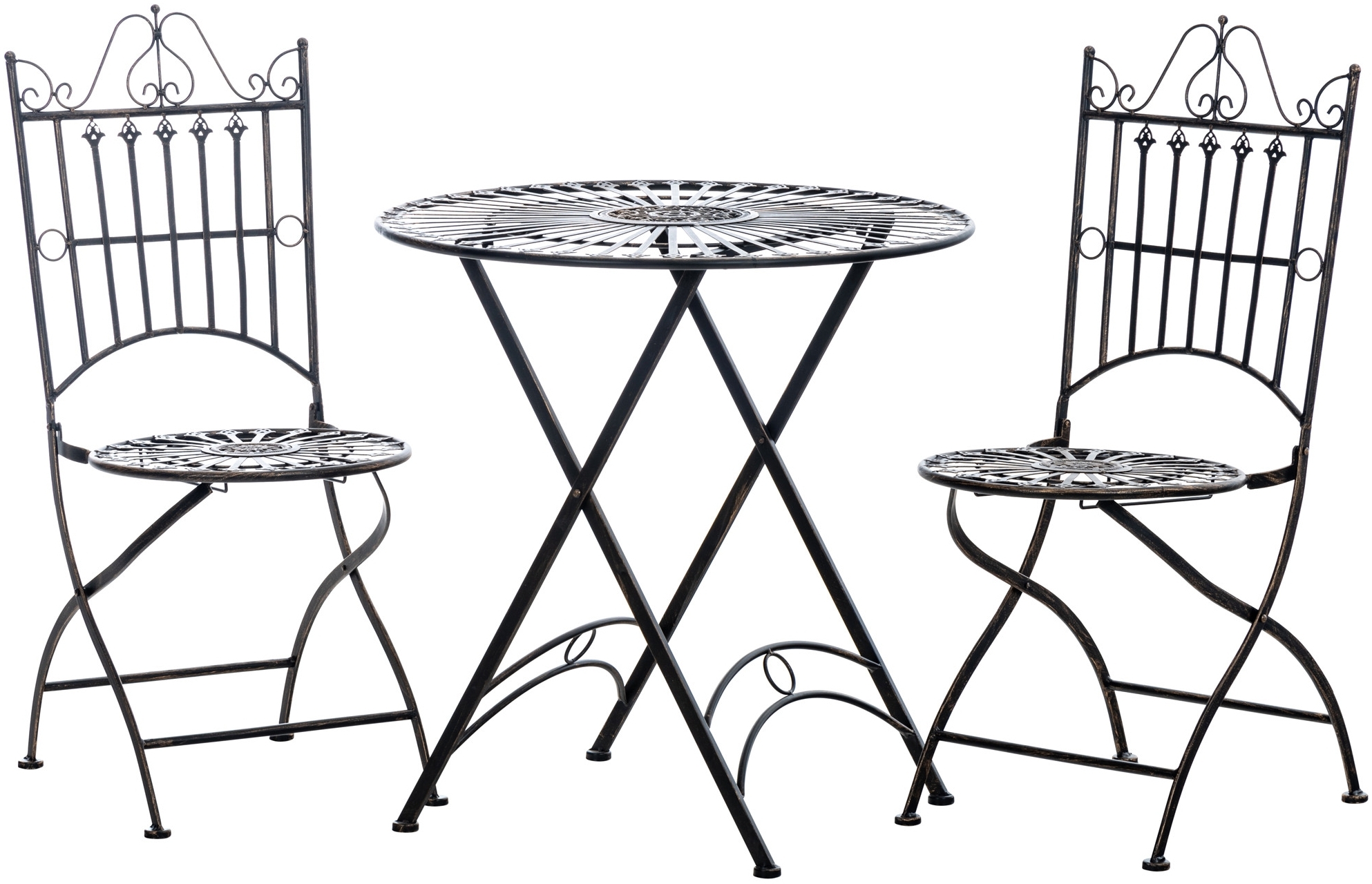 Die CLP Sitzgruppe Tegal aus Metall in bronze ist ein stilvolles Möbelstück für Ihren Garten. Mit ihrem nostalgischen Design und den grazilen Formen zieht sie alle Blicke auf sich. Gefertigt aus stabilem Eisen mit antiker Patina, bietet sie nicht nur Langlebigkeit, sondern auch Flexibilität, da die Möbel platzsparend zusammengeklappt werden können. **Highlights** - Nostalgisches Design: Verleiht Ihrem Garten eine besondere Note. - Stabil und langlebig: Gefertigt aus Eisen mit antiker Patina. - Platzsparend: Einfach zusammenklappbar und zu verstauen. - Vielseitig einsetzbar: Perfekt für Ihren Lieblingsplatz im Garten. - Detailreiche Verzierungen: Ein echter Blickfang. **Produkteigenschaften** - Material: Eisen - Farbe: Bronze - 2 Stühle: - Gesamthöhe: 94 cm - Gesamtbreite: 39 cm - Gesamttiefe: 53 cm - Sitzhöhe: 44 cm - Sitzfläche: 39 x 39 cm - Höhe Rückenlehne: 52 cm - Gewicht: 5 kg - Tisch: - Gesamthöhe: 71 cm - Gesamtbreite: 71 cm - Gesamttiefe: 71 cm - Gewicht: 5 kg