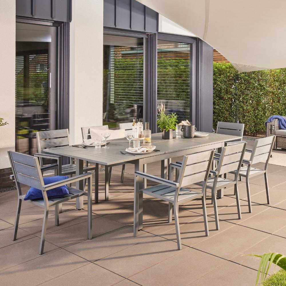 Beschreibung **Produktbesonderheiten:** * Ausziehbarer Gartentisch * In UV - beständiger und abriebfester Qualität * Witterungsbeständiger Gartenstuhl * Gestell aus robustem Aluminium * Platzsparend stapelbar * Strapazierfähig