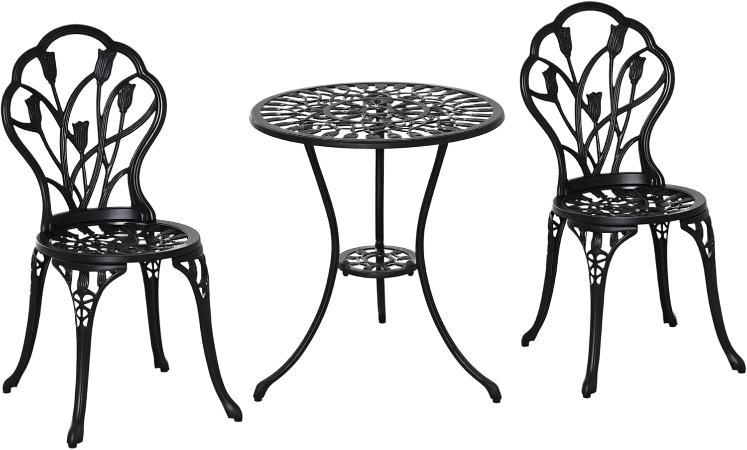 Dieses 3-teilige Gartenmöbel-Set von Outsunny ist die beste Wahl, um die frische Luft Zuhause, im Garten oder an anderen Orten zu genießen. Dieses Balkonmöbel hat eine einfache und moderne Erscheinung, die für verschiedene Anlässe geeignet ist. Sie können es zusammen mit Ihrem Freund genießen, um einen angenehmen Nachmittagstee im Garten zu haben, **Beschreibung:** ● 3-teiliges Bistro-Set: 1 runder Tisch und 2 Stühle ● Das geschnitzte Design aus Aluminium ist schick und stilvoll und trocknet schnell nach Regen ● Voll-Aluminium-Rahmen für Haltbarkeit und Stabilität ● Ideal für Gärten, Balkone und Frühstücksecken ● Mit Schirmloch in der Mitte des Tisches für einen Schirm mit Ø42mm oder Ø38mm Stockdurchmesser ● Montage erforderlich **Technische Daten:** ● Farbe: Schwarz ● Material: Aluminium ● Tischgröße: Ø60 x 67H cm ● Stuhl-Größe: 42,5B x 47,5T x 89H cm ● Sitzgröße: 37B x 37T x 41H cm ● Schirmloch-Durchmesser: Ø44 mm ● Belastbarkeit: (Tisch) 30 kg, (Stuhl) 110 kg **Lieferumfang:** ● 1 x Tisch ● 2 x Stuhl ● 1 x Anleitung