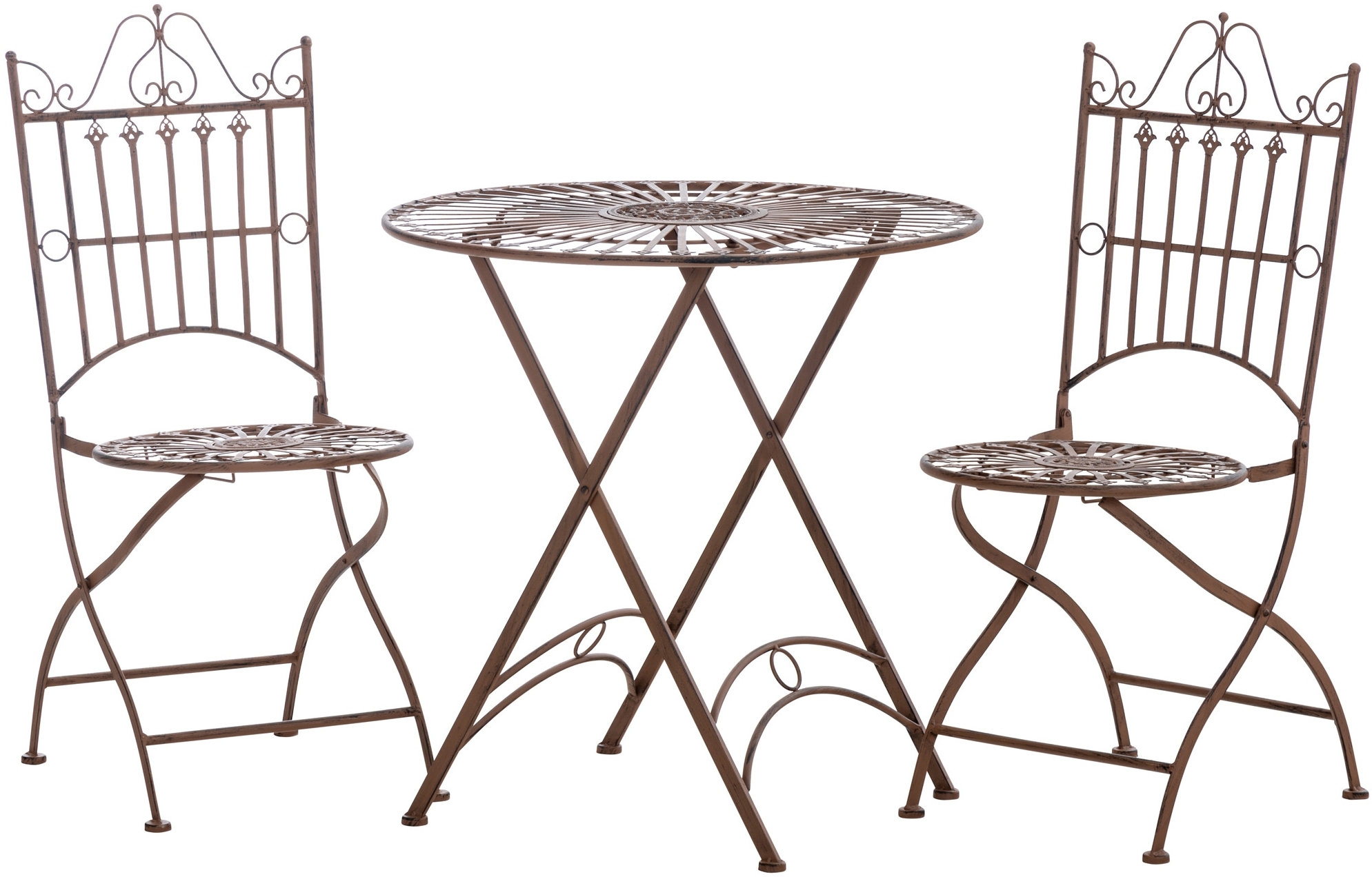 Die CLP Sitzgruppe Tegal aus Metall in antik braun vereint nostalgisches Design mit stabiler Bauweise. Hergestellt aus robustem Eisen mit antiker Patina, bietet sie nicht nur einen besonderen Charme für Ihren Garten, sondern ist auch platzsparend zusammenklappbar. Die Stühle und der Tisch sind ideal für entspannte Stunden im Freien. **Highlights** - Nostalgisches Design: Verleiht Ihrem Garten eine besondere Note. - Stabil und langlebig: Aus Eisen gefertigt. - Platzsparend: Einfach zusammenklappbar. - Antike Patina: Für einen authentischen Look. - Vielseitig einsetzbar: Perfekt für Ihren Lieblingsplatz im Garten. **Produkteigenschaften** - Farbe: antik braun - Material: Eisen - Oberfläche: antike Patina - Maße Stuhl: 94 x 39 x 53 cm (H x B x T), Sitzhöhe 44 cm - Maße Tisch: 71 x 71 x 71 cm (H x B x T) - Gewicht Stuhl: 5 kg, Tisch: 5 kg **Lieferumfang** - 2x Stuhl - 1x Tisch