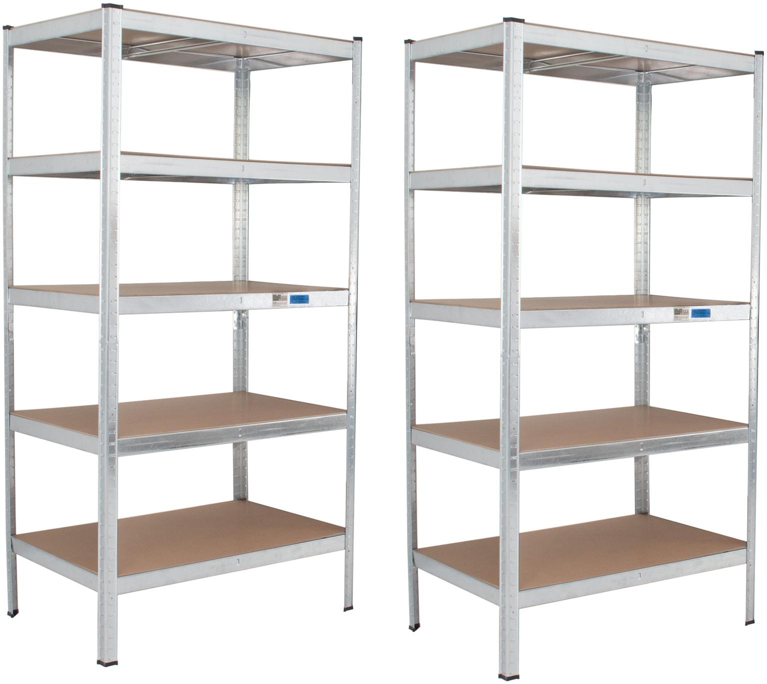| Beschreibung | Das 2er-Set Schwerlastregal von TRUTZHOLM bietet mit seinen Abmessungen von 180 x 90 x 60 cm und einer Traglast von 875 kg pro Regal optimale Lagermöglichkeiten für Werkstatt, Garage oder Hobbykeller. Das verzinkte Steckregal ist stabil, flexibel und lässt sich ohne Schrauben einfach montieren. Zudem kann es bei Bedarf auch als Werkbank genutzt werden. **Highlights** - Stabiles Stecksystem ohne vorstehende Kanten - Montage ohne Schrauben - Möglichkeit zur Umfunktionierung zu einer Werkbank - Hohe Gesamttragkraft von 875 kg - Inklusive Regalverbinder für zusätzliche Stabilität **Produkteigenschaften** - Maße: 180 x 90 x 60 cm - Gewicht: 18,4 kg - 5 Böden pro Regal - Aus verzinktem Stahl - Je höher die Belastung, desto fester die Steckverbindung **Lieferumfang** - 2x TRUTZHOLM Schwerlastregal (unmontiert, originalverpackt) - Montageteile: 5 Böden, 8 Bodenkappen, 5 Bodenverstärkungen, 10 kurze Seitenstege, 10 lange Seitenstege, 8 Pfosten, 4 Regalverbinder, 4 Pfostenverbinder |
