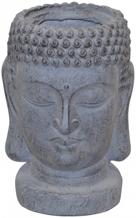 Pflanzkübel "Buddhakopf I" aus Polyresin (Magnesium-Pulver), naturgrau lackiert, mit schönen Details gearbeitet. Mit Pflanzeinsatz (Ø13 x Höhe 15 cm) gearbeitet. Gesamtmaße ca. cm: (B/H/T) 23/34/24.