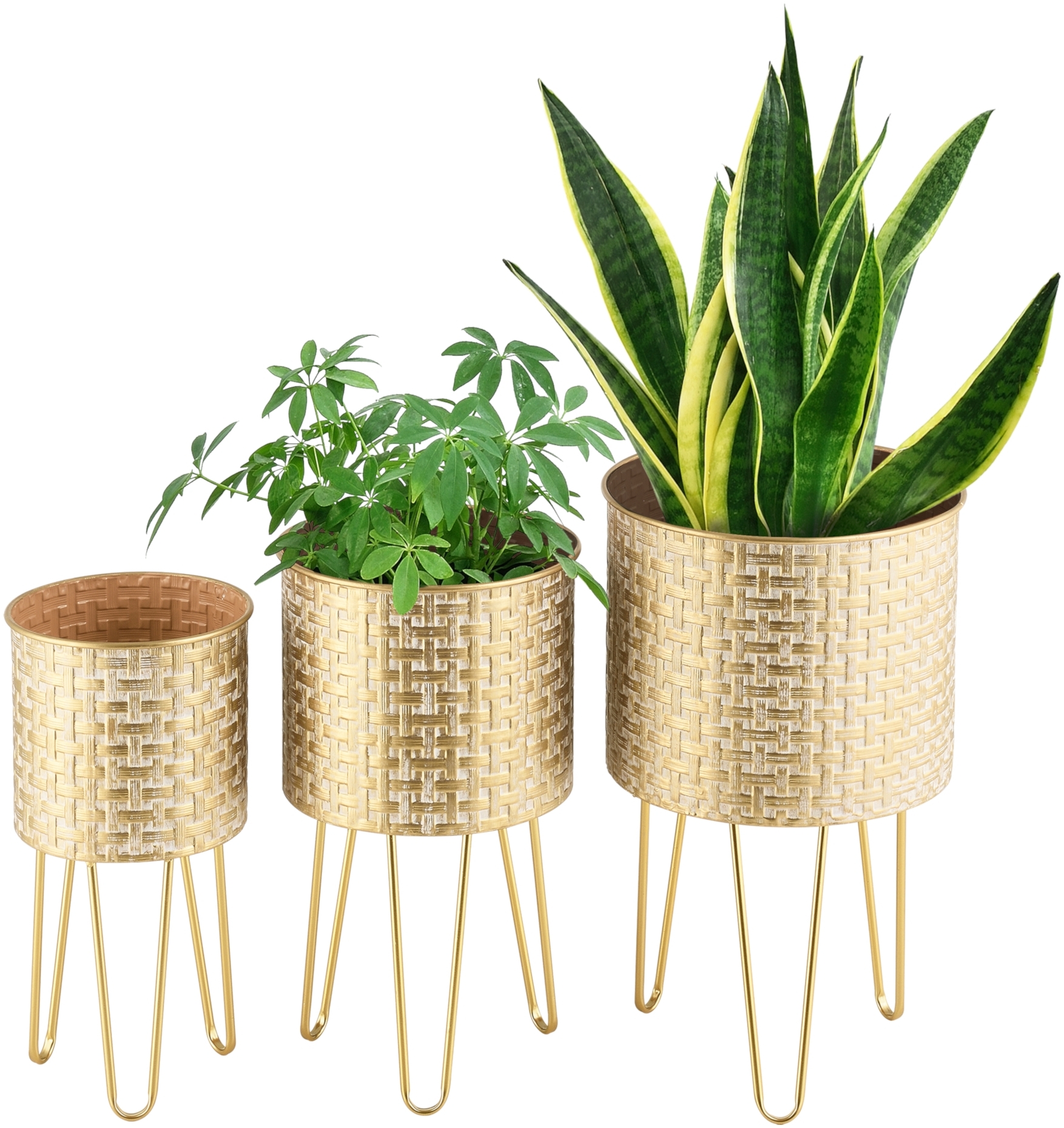 Diese ausgefallenen Blumentopfständer im 3er Set aus Metall sind mit ihrem zeitlosen und dekorativen Design ein echter Hingucker in Ihrem Wohnbereich. Die unterschiedlichen Größen ermöglichen eine vielseitige Gestaltung und setzen Ihre Pflanzen perfekt in Szene. **Highlights** - 3 unterschiedlich große Blumentopfständer im Set - Perfekt geeignet als Pflanztöpfe für Ihr Wohnzimmer - Zeitloses und dekoratives Design **Produkteigenschaften** - Maße Pflanzständer 1 (HxBxT): 41,5 x 21 x 21 cm - Übertopf 1 (HxØ): 18,5x21 cm - Maße Pflanzständer 2 (HxBxT): 46,5 x 26 x 26 cm - Übertopf 2 (HxØ): 21,5x26 cm - Maße Pflanzständer 3 (HxBxT): 50,5 x 31 x 31 cm - Übertopf 3 (HxØ): 24,5x31 cm - Material: Metall - Farbe: Messingfarben **Lieferumfang** - 1 x Blumenständer-Set (bestehend aus 3 Pflanztopfhaltern in unterschiedlichen Größen)