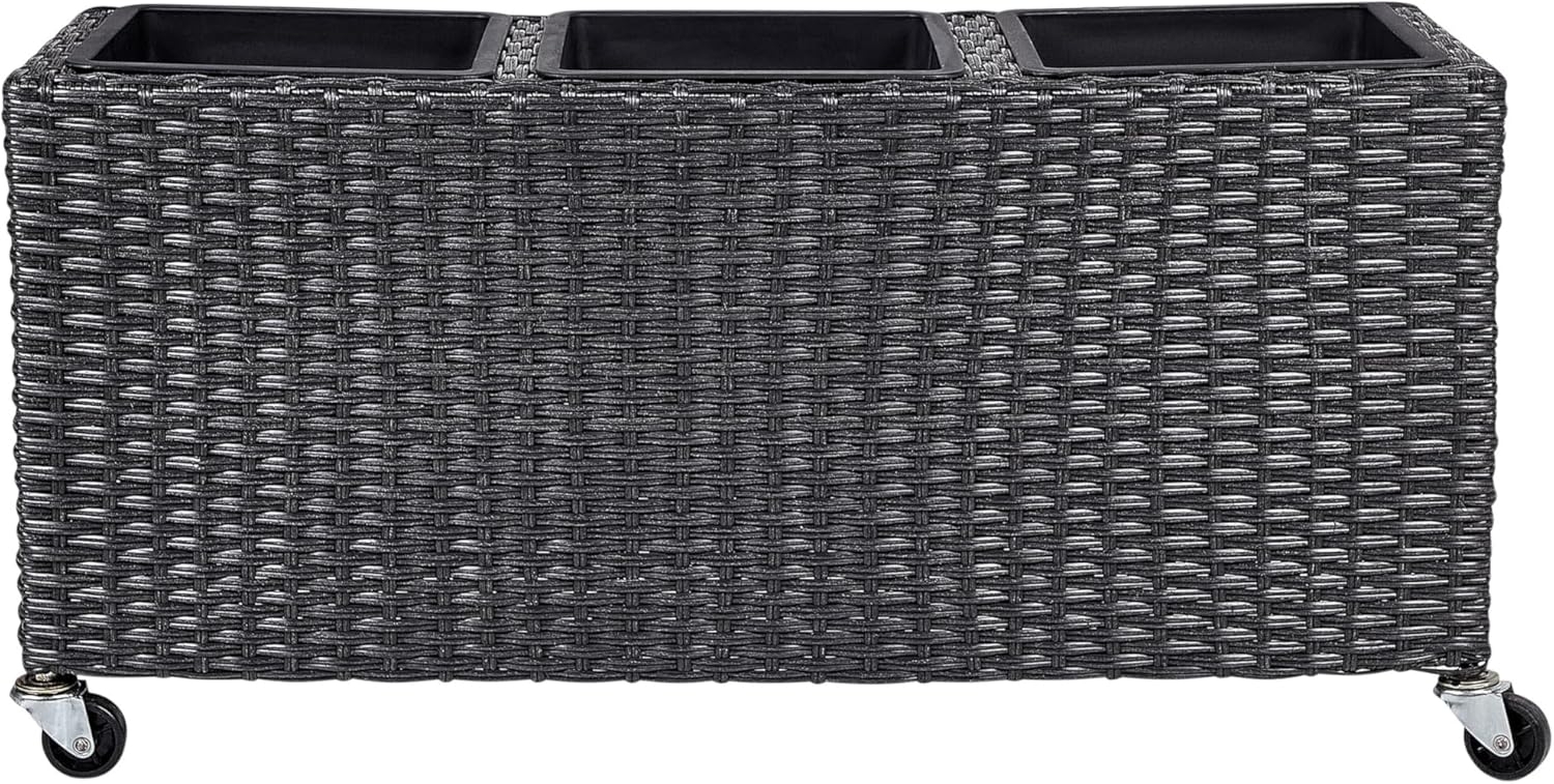 Ein rechteckiger Blumenkübel aus hochwertigem PE Rattan in Schwarz, ausgestattet mit praktischen Rollen für einfachen Transport. Der Blumenkasten verfügt über drei herausnehmbare Kunststoffeinsätze, die die Pflege Ihrer Pflanzen erleichtern. Das stabile Stahlgestell sorgt für Langlebigkeit, während das Rattangeflecht vor Wurzelwachstum schützt. Ideal für den Innen- und Außenbereich. **Highlights** - Rollfüße für einfachen Transport - Handgefertigtes Flechtwerk - Dekorativ und funktional - Geeignet für Innen- und Außenbereich - Qualitativ hochwertiges Material **Produkteigenschaften** - Typ: Indoor Blumentopf - Stil: Rustikal - Farbe: Schwarz - Material: PE Rattan, Stahl - Form: Rechteckig - Abflusslöcher am Boden: Ja - Finish: Pulverbeschichtet - Max. Aufheiztemperatur: 40 °C - Min. Aufheiztemperatur: 20 °C - Volumen: 6,5 Liter - Maße: 82 x 28 x 40 cm (B x T x H) - Gewicht: 4 kg - Beständigkeit: Temperaturbeständig **Lieferumfang** - 1 x Blumenkübel - 3 x Kunststoffeinsätze - Keine Montage erforderlich