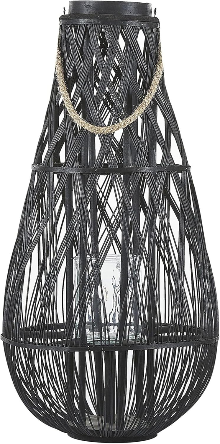 Hohe Laterne TONGA aus Bambusholz in Schwarz, die jedem Wohnraum ein hawaiianisches Flair verleiht. Mit einem stabilen, runden Fuß und einem geflochtenen Seilhenkel ausgestattet, ist sie sowohl zum Aufhängen als auch zum Tragen geeignet. Im Inneren befindet sich ein Glas-Kerzenhalter, der für eine stimmungsvolle Beleuchtung sorgt. **Highlights** - Robuster Tragehenkel für einfache Handhabung - Gut kombinierbar mit vielen Einrichtungsstilen - Dekorativ und zugleich funktional - Geeignet für den Innen- und Außenbereich - Pflegeleichtes und strapazierfähiges Material **Produkteigenschaften** - Typ: Windlichtsäulen - Stil: Rustikal - Farbe: Schwarz - Material: Bambusholz - Zusätzliches Material: Glas - Form: Oval - Handgefertigt: Ja - Maße (HxBxT): 77 x 39 x 39 cm - Gewicht: 2 kg **Lieferumfang** - 1 x Laterne - Lieferung ohne Kerze