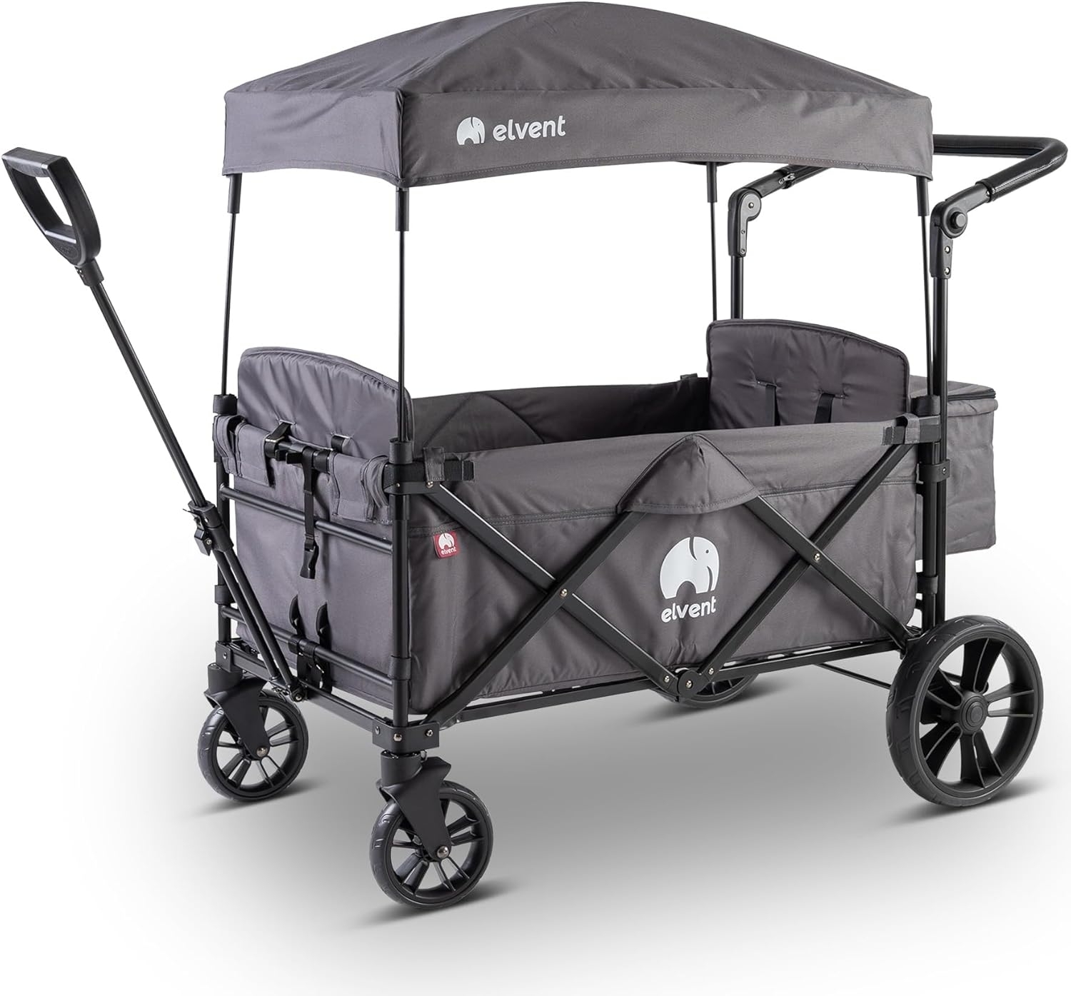 Der elvent® All Rounder City ist ein hochwertiger und komfortabler Bollerwagen in großer Größe und für bis zu 2 Kinder. 5-Punkt-Gurte halten deine Kinder während der Fahrt sicher auf ihren Sitzen. Die Räder sind aus robustem, dämpfenden PU-Material für ein angenehmes Fahrgefühl und für guten Gripp auf allen Untergründen. Mit der Fußbremse steht der Bollerwagen fest und sicher - mit nur einem leichten Tritt. Eine gefederte Hinterachse schützt die Wirbelsäule der kleinen Ausflügler vor Stößen und ist auch für die Eltern angenehmer beim Schieben. Der Schiebegriff ist extralang, damit auch größere Menschen den Bollerwagen rückenschonend in gerader Haltung fortbewegen können. Du kannst entspannt schieben, denn die Füße kommen beim Anschieben durch den größeren Abstand nicht unter die Räder. Der Schiebegriff aus Kunstleder ist komfortabel, robust und pflegeleicht feucht abwischbar. Bei Ausflügen im Sonnenschein sind deine Kinder durch das stabil befestigte, robuste und perfekt passende Sonnendach gut geschützt vor Hitze und schädlichen UV-Strahlen. Auch bei einem kleinen Regenschauer sind deine Kinder zumindest von oben geschützt, während das umschließende Sitzpolster das Kind kuschelig warmhält. Das Dach kannst du jederzeit mit wenigen Handgriffen anbringen oder es wieder abmontieren und kompakt verstauen. Der Bollerwagen elvent® All Rounder City bietet den kleinen Passagieren durch die gemütlichen Sitz- und Rückenpolster noch mehr Komfort. Getränke, kleine Mahlzeiten, Sonnencreme, Windeln und mehr finden in der großen Premium-Hecktasche Platz. Die Hecktasche hat die Maße 39 cm breit x 19 cm tief x 29 cm hoch. Nach eurem Ausflug kannst du euren Bollerwagen mit nur einem Handgriff blitzschnell zusammenklappen und platzsparend verstauen. Tipp: Sollte der Bollerwagen vom Ausflug feucht oder sogar nass sein, lasse ihn vor dem Verstauen gut austrocknen. Sonst kann sich Schimmel bilden. Zusammen mit eurem neuen Bollerwagen bekommst du eine anschaulich bebilderte Bedienungsanleitung in deutscher Sprache. Bei Fragen ist unser Service-Team gern für dich da. Der elvent® All Rounder City hat keine extragroßen und extrarobusten Off-Road-Räder. Wenn du oft auf besonders unebenem Gelände unterwegs bist, empfehlen wir den elvent® All Rounder Premium. Dieser Bollerwagen hat die speziellen Off-Road-Räder, mit denen ihr in jedem Gelände gut unterwegs seid. Die anderen Bollerwagen von elvent® Aktuell bekommst du von elvent® 4 Modellreihen an Bollerwagen in verschiedenen Größen und mit unterschiedlichen Ausstattungen: den All Rounder, den Family Star, den Smart Cruiser und den Wagon Pro. Egal, wofür du dich entscheidest: Du triffst immer eine gute Wahl, weil wir auf Qualität setzen!