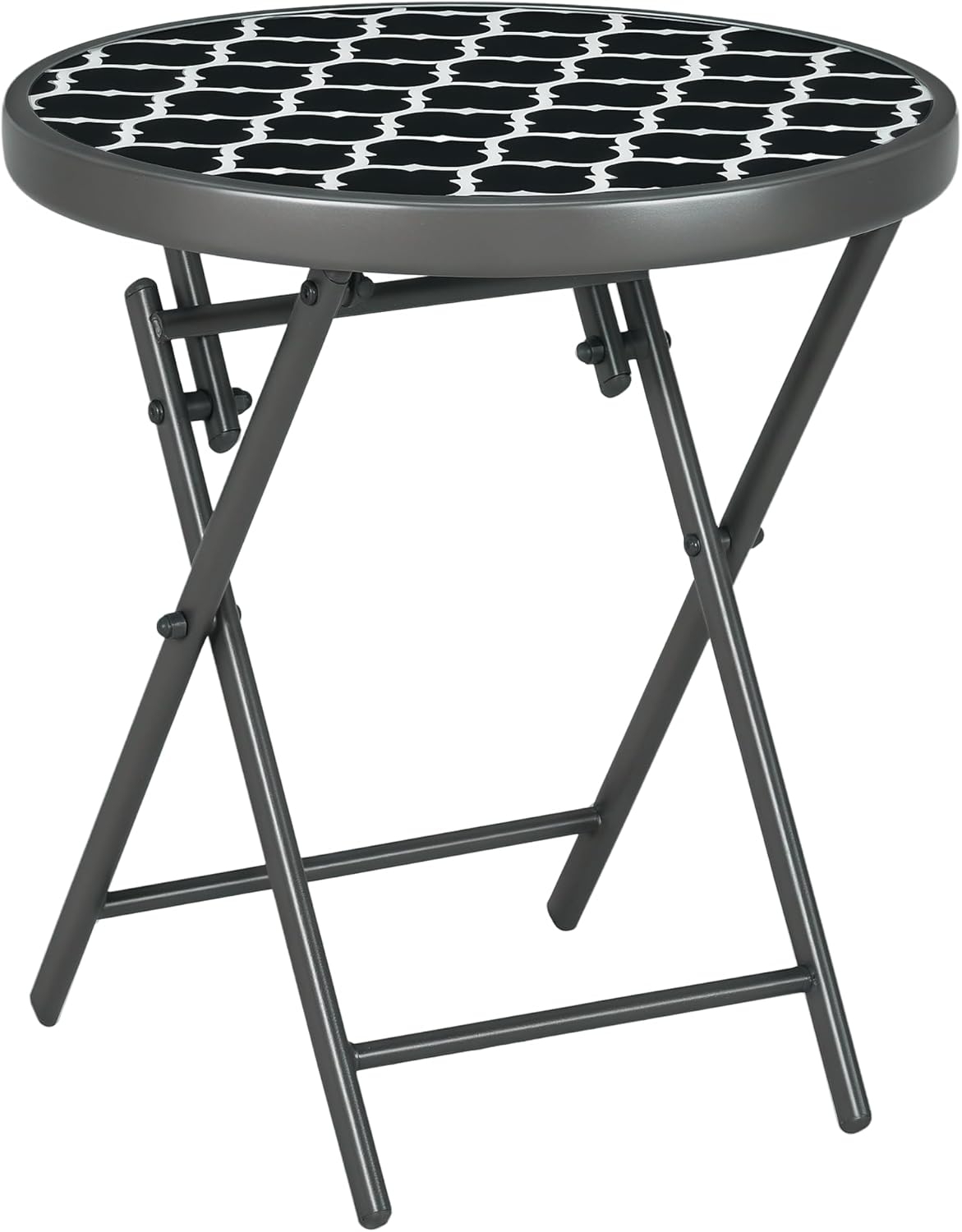 Der Outsunny Gartentisch ist ein klappbarer Beistelltisch, ideal für Garten, Terrasse oder Balkon. Mit einem Durchmesser von 45 cm und einer Höhe von 50 cm bietet er ausreichend Platz für Getränke und Snacks. Die schwarze, bedruckte Sicherheitsglasplatte sorgt für eine einfache Reinigung, während das pulverbeschichtete Metallgestell Langlebigkeit und Wetterfestigkeit garantiert. Dank des klappbaren Designs ist der Tisch platzsparend und leicht zu transportieren. **Highlights** - Klappbares Design für einfachen Transport und Stauraum - Platz für Getränke und Snacks - Einfache Reinigung der Glasplatte mit einem feuchten Tuch - Rutschfeste Kunststoff-Füße schützen den Boden vor Kratzern - Keine Montage erforderlich **Produkteigenschaften** - Farbe: Schwarz - Material: Metall, Hartglas - Tisch-Abmessungen: Ø 45x50 cm - Zusammengeklappte Größe: 68 x 45 x 7,5 cm - Gewichtskapazität: 25 kg **Lieferumfang** - 1 x Beistelltisch - 1 x Handbuch