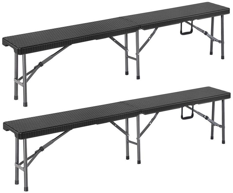 Die Casaria Klappbank Camping Malmö ist ideal für unterwegs und überzeugt mit ihrer platzsparenden und robusten Bauweise. Das Set besteht aus zwei Bierbänken in stilvoller Rattan-Optik. Die Sitzbänke haben ein stabiles Gestell aus pulverbeschichtetem Stahl und eine pflegeleichte Oberfläche aus UV- und witterungsbeständigem Polyethylen. Dank der praktischen Klappfunktion lassen sich die Bänke schnell und einfach auf- und zusammenklappen. Mit den seitlichen Tragegriffen und dem geringen Gewicht sind sie kofferraumfreundlich und leicht zu transportieren. Die Bierbänke eignen sich perfekt für Geburtstage, Partys, Vereinsfeiern oder Campingausflüge. Sie sind sowohl für den Innen- als auch für den Außenbereich geeignet und verfügen über rutschfeste Bodenschoner, um Kratzer zu vermeiden. Die Casaria Klappbank Camping Malmö bietet angenehmen Sitzkomfort und ist einfach zu reinigen. **Highlights** - Robustes und langlebiges Bierbank-Set - Praktische Klappfunktion für einfaches Auf- und Zusammenklappen - Kofferraumfreundlich dank seitlicher Tragegriffe und geringem Gewicht - Vielseitig einsetzbar für verschiedene Anlässe - Bodenschonende rutschfeste Bodenschoner **Produkteigenschaften** - Maße (LxBxH): 180 x 25 x 43 cm - Maße zusammengeklappt (LxBxH): 90 x 9,5 x 25 cm - Gewicht pro Bank: 7,5kg - Material Gestell: pulverbeschichteter Stahl - Material Geflecht: HDPE-Kunststoff - Farbe: schwarz **Lieferumfang** - 2x Sitzbank in Poly Rattan-Optik - Montagematerial & Aufbauanleitung