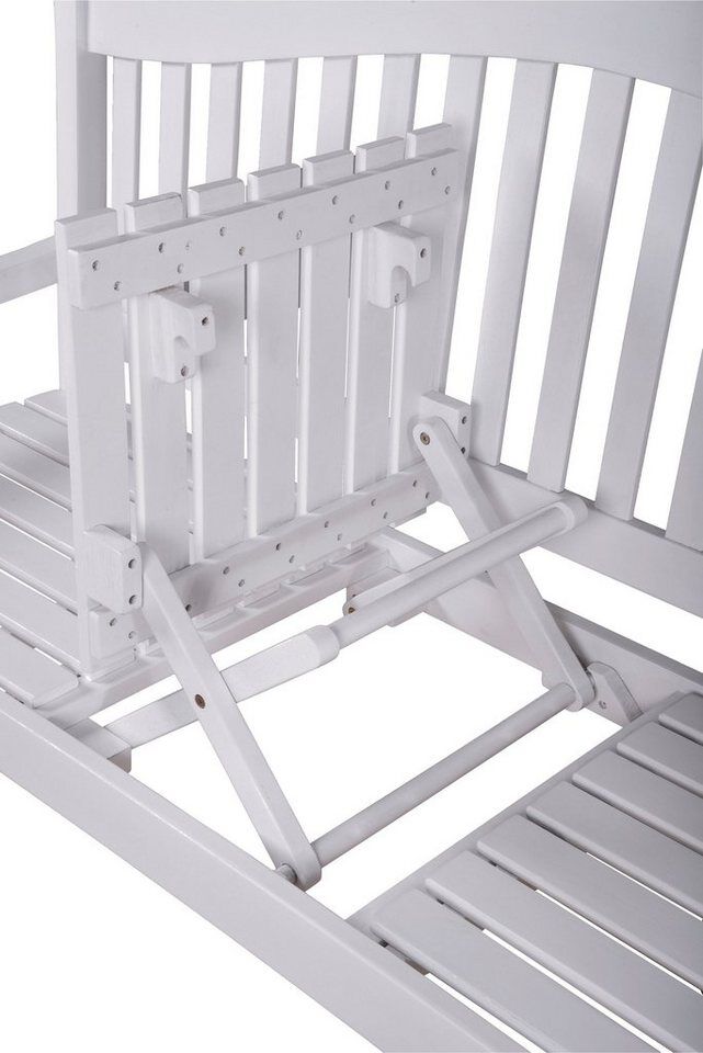 **Für die schönen Stunden zu zweit, weiße Gartenbank aus 100% Eukalyptus Holz** Schöner könnten die gemeinsamen Stunden zu zweit nicht sein. Dank dieser Gartenbank mit hochklappbarem Tisch aus 100% Eukalyptus Weiß ist die kleine Auszeit schnell bereitet. In der Mitte der Sitzfläche ist ein hochklappbarer Tisch integriert. So findet das Geschirr für den kleinen Snack schnell einen Platz. Mit einem Handgriff wird der kleine Tisch auf- oder wieder zusammengeklappt. Praktische Gartenbänke dieser Art erleichtern den Alltag. Für hohen Sitzkomfort ist die Rückenlehne harmonisch gerundet und bietet komfortable Armlehnen. Das moderne Design verbindet darüber hinaus klassische Elemente und überzeugt mit einem stilvollen Design. Mit der schönen white washed Oberfläche passt diese Gartenbank in jeden Teil des Gartens und kann an schattigen wie sonnigen Plätzen aufgestellt werden. Gartenbänke mit klappbarem Tisch sorgen für erholsame Entspannungszeiten. * **Maße ca. B/H/T: 150 x 103 x 63 cm** * **Sitzhöhe 45 cm** * **Sitztiefe 46 cm** * **Rückenhöhe: 58 cm** * **Sitzbreite: 142 cm** * **Oberfläche white washed** * **FSC Eukalyptus** * **Belastbar bis 240 kg** Die Gartenbank lässt sich schnell und einfach montieren.