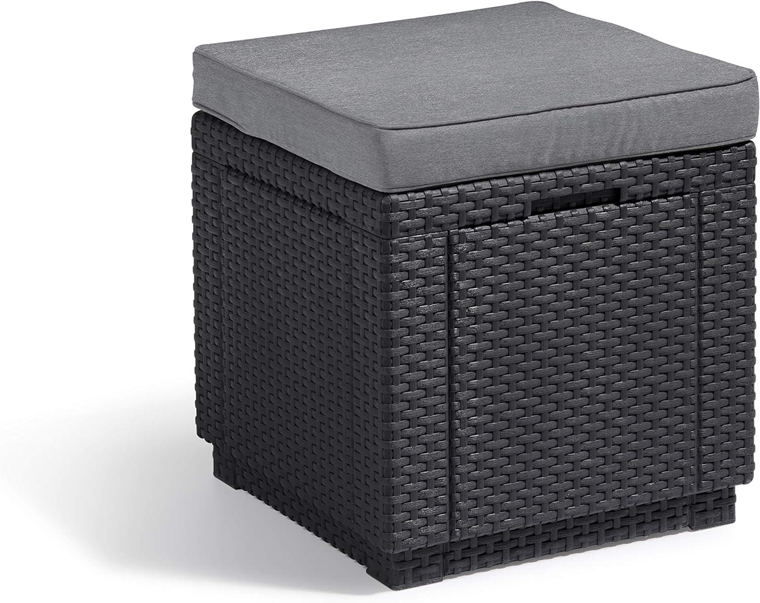 | Name | Allibert by Keter Cube Hocker mit Stauraum, grau, inkl. Kissen, Deckel abnehmbar, flache Rattanoptik, wetterfest, 42 x 42 x 39 cm |