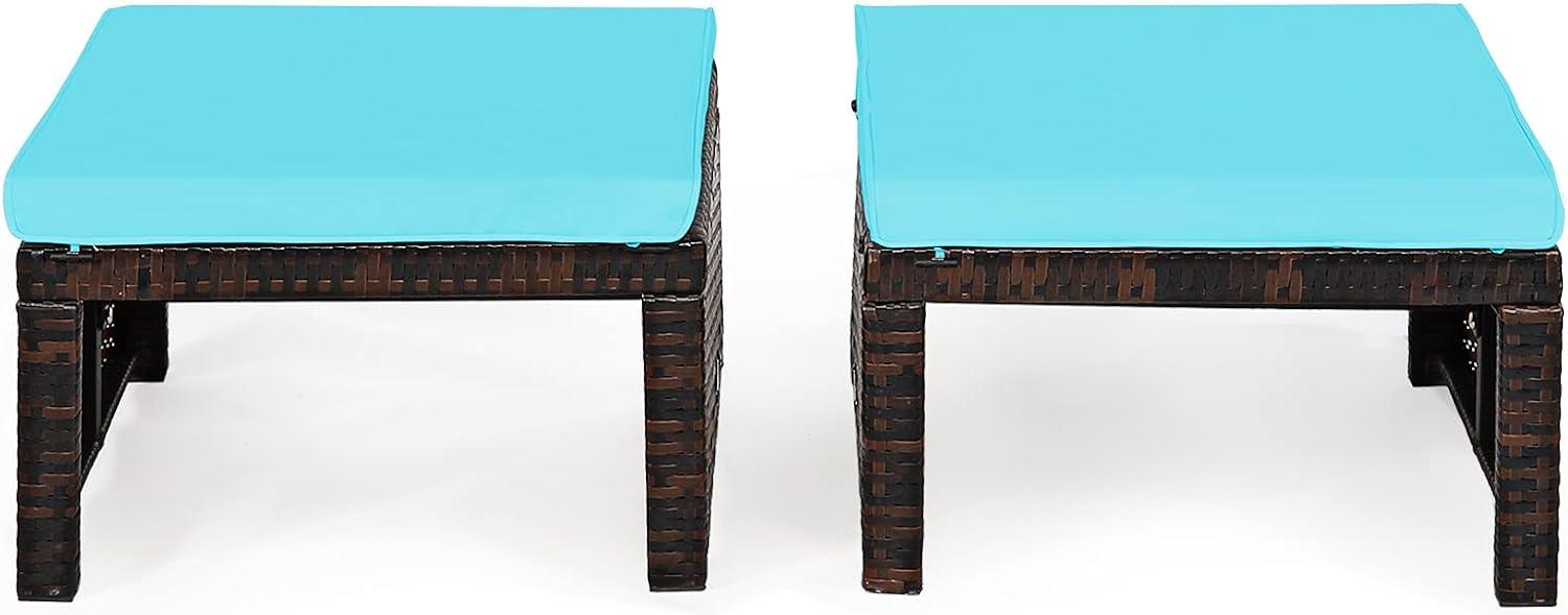 Die COSTWAY Rattan Ottomanen sind die perfekte Ergänzung für Ihren Außenbereich. Das 2er Set besteht aus wetterfestem PE-Rattan und ist mit einem weichen Kissen ausgestattet, das maximalen Komfort bietet. Das stabile X-Gestell und die verstärkten Querstreben sorgen für Robustheit und Stabilität. Die abnehmbaren Kissenbezüge ermöglichen eine einfache Reinigung. Mit einem eleganten Aussehen passen diese Hocker perfekt in jeden Raum wie Innenhof, Garten oder Pool. Sie können als Sitz oder Fußstütze verwendet werden. **Highlights** - Wetterfestes PE-Rattan für den Außenbereich geeignet - Abnehmbare Kissenbezüge für einfache Reinigung - Stabiles X-Gestell und verstärkte Querstreben für Robustheit - Multifunktionales Design als Sitz oder Fußstütze verwendbar - Elegantes Aussehen für jeden Raum geeignet **Produkteigenschaften** - Farbe des Kissens: Türkis - Farbe des Rattans: Braun - Material: PE-Rattan + Schaumstoff - Produktmaße (inkl. Kissen): 49 x 40 x 33 cm (L x B x H) - Nettogewicht: 7 kg - Maximales Gewicht: 160 kg **Lieferumfang** - 2 x Ottomane - 2 x Kissen - 1 x Anleitung