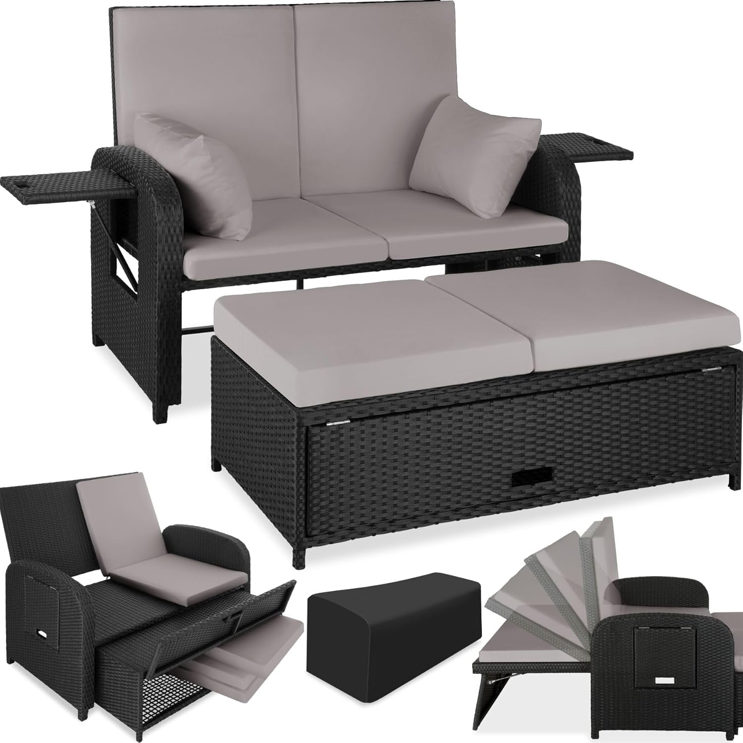 Rattan Sofa mit Aluminiumgestell Kreta in Schwarz und Grau bietet vielseitigen Komfort für bis zu 4 Personen. Mit einem innovativen Gasdruckfedersystem und einer 6-fach höhenverstellbaren Rückenlehne genießen Sie flexible Entspannung. Das wetterfeste Polyrattan und das rostfreie Aluminiumgestell garantieren Langlebigkeit. Extradicke, wasserabweisende Kissen mit abnehmbaren Bezügen sorgen für zusätzlichen Komfort. Die praktische Schutzhülle schützt das Sofa vor Witterungseinflüssen. **Highlights** - Multifunktional: Gartenlounge, 2-Sitzer Sofa mit Schlaffunktion oder Liegestuhl - 6-fach höhenverstellbare Rückenlehne für individuelle Entspannung - Wetterfestes und rostfreies Aluminiumgestell für Langlebigkeit - Extradicke, wasserabweisende Kissen für hohen Sitzkomfort - Inklusive Schutzhülle für optimalen Witterungsschutz **Produkteigenschaften** - Maße: geeignet für bis zu 4 Personen - Material: UV-beständiges Polyrattan, Aluminiumgestell - Kissen: abnehmbar und waschbar - Stauraum im Hocker für Auflagen - Bodenschonende Füße aus Kunststoff **Lieferumfang** - Rattan Sofa mit Aluminiumgestell - Schutzhülle - Hocker mit Stauraum - Kissen (nicht separat aufgeführt)