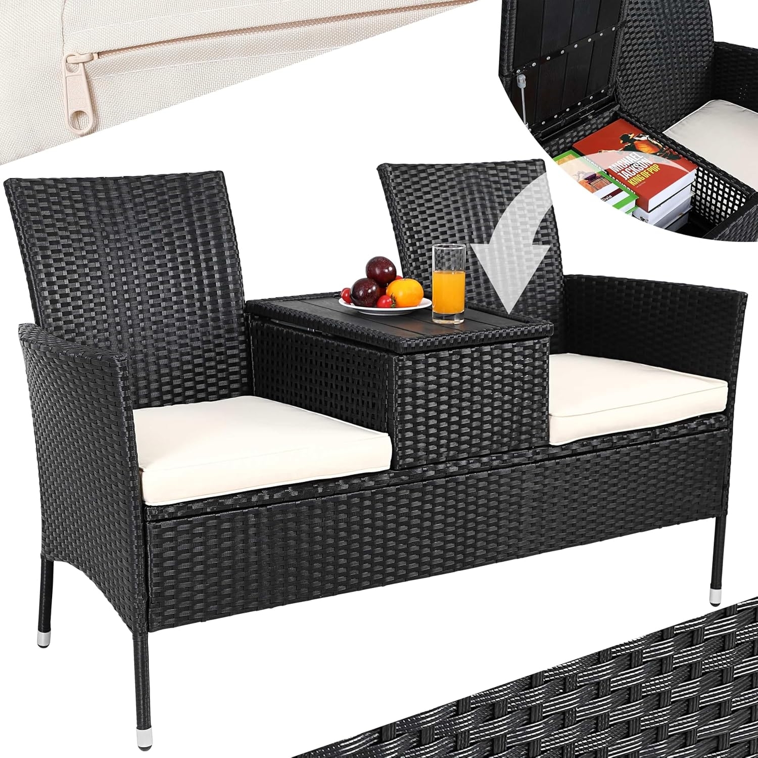 Die Deuba Gartensofa Polyattan mit Auflage ist eine gemütliche Sitzbank für Ihren Außenbereich. Das aufwändig handgewobene Polyrattangeflecht in edlem Schwarz verleiht der Bank eine moderne und zeitlose Optik. Ein besonderes Highlight ist der integrierte Tisch mit Polywood Tischplatte und Aufbewahrungsbox. Hier können Sie Ihre Drinks, Smartphone, Tablet oder andere Utensilien abstellen oder in der Box verstauen. Das pulverbeschichtete Gestell aus robustem Stahl trägt bis zu 160 kg pro Seite. Die bequemen Sitzauflagen mit einer hohen Schaumstoffdichte und Grammatur sorgen für extra Komfort. Sie sind wasserabweisend, abnehmbar und waschbar. Das Polyrattan-Geflecht ist wetterfest, UV-Lichtbeständig, schmutzabweisend und einfach zu reinigen. **Highlights** - Polywood Tischplatte - Aufbewahrungsbox mit Gaslifter - Handgewobenes Polyrattan-Geflecht - 7cm Polsterstärke - Auflagen doppelt gekettelt, waschbar, wasserabweisend **Produkteigenschaften** - Material Geflecht: Polyrattan - Material Gestell: Stahl - Material Bezugsstoff: 100% Polyester - Maße (LxBxH) (Bank): 143 x 64 x 88 cm - Maße (LxBxH) (Polywood Tisch): 35 x 51 x 23 cm - Farbe: Schwarz **Lieferumfang** - 1x Polyrattan Gartenbank - Aufbauanleitung - Montagematerial