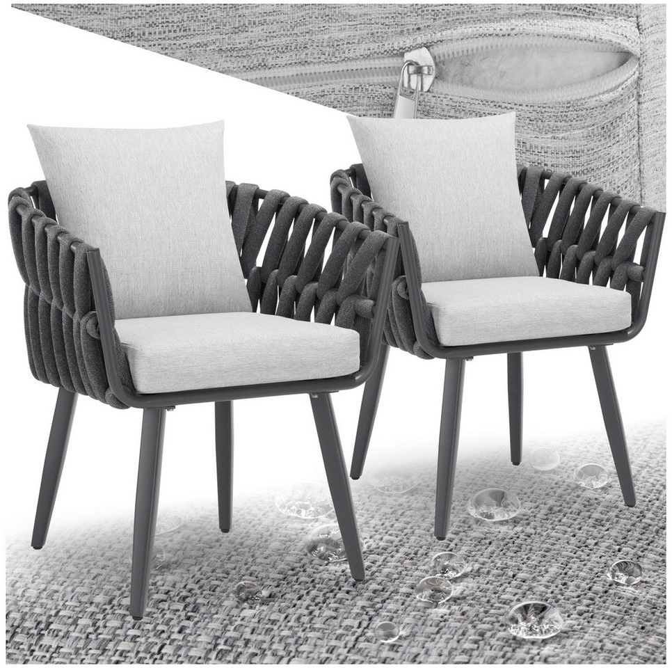 Entdecken Sie das 2er-Set Gartenstühle Lugano von tectake, das hochwertige Design mit außergewöhnlichem Komfort vereint. Diese Stühle sind sowohl für den Innen- als auch für den Außenbereich geeignet. Mit extra dicken Rückenkissen und bequemen Sitzpolstern bieten sie unvergleichliche Erholung. Die pflegeleichten, wasserabweisenden Bezüge und das robuste Aluminiumgestell machen sie zur idealen Wahl für jede Jahreszeit. **Highlights** - Hochwertiges Rope-Design für eine moderne Optik - Wasserabweisende, abnehmbare und waschbare Bezüge - Höhenverstellbare, bodenschonende Kunststofffüße für stabilen Halt - Extrem leichtes und rostfreies Aluminiumgestell - Einfache Montage in wenigen Minuten **Produkteigenschaften** - Totalmaße (BxTxH): ca. 61 x 60 x 73 cm - Sitzpolster (BxTxH): ca. 44 x 44 x 8 cm - Rückenkissen (BxTxH): ca. 41 x 15 x 41 cm - Sitzhöhe mit Sitzkissen: ca. 47 cm - Verstellbarkeit der Kunststofffüße: ca. 1,5 cm - Belastbarkeit: je 120 kg - Gewicht: ca. 5,1 kg - Material: pulverbeschichtetes Aluminium, Polypropylen, Polyethylen, Stahl, 100 % Polyester **Lieferumfang** - 2 Stühle mit je einem Sitzpolster und Rückenkissen - Montagematerial - Montageanleitung