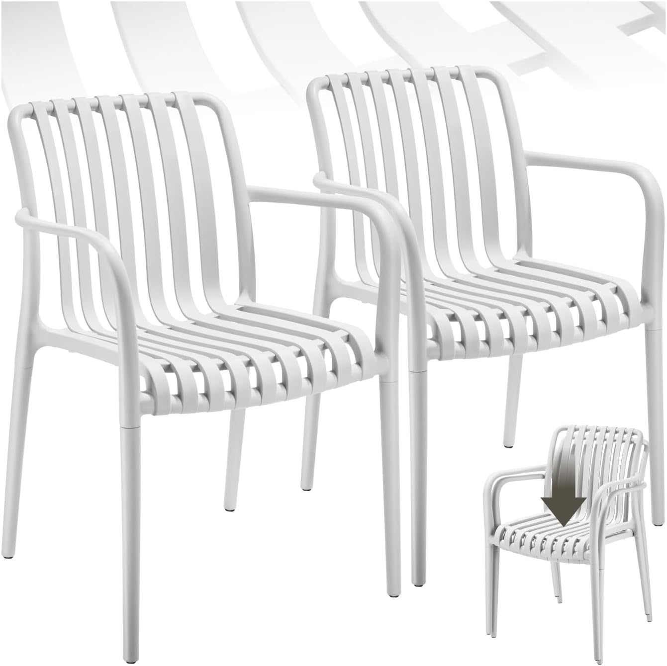 Entdecken Sie die stilvollen Gartenstühle Alcudia von tectake, die mit klaren Linien und einer offenen Struktur eine sommerliche Leichtigkeit ausstrahlen. Hergestellt aus hochwertigem, wetterfestem Kunststoff, sind diese Stühle pflegeleicht und widerstandsfähig. Mit einer hohen Rückenlehne und breiten Armlehnen bieten sie optimalen Komfort. Die rutschfesten Gummischoner sorgen für Standsicherheit, während die Stapelbarkeit eine platzsparende Aufbewahrung ermöglicht. **Highlights** - Wetterfest und langlebig: Ideal für den Außenbereich, trotzt jeder Wetterlage. - Rutschfeste Gummischoner: Garantiert Standsicherheit auf jedem Untergrund. - Pflegeleicht: Einfach mit einem feuchten Tuch zu reinigen. - Stapelbar: Platzsparende Aufbewahrung bei Nichtgebrauch. - Hohe Belastbarkeit: Bis zu 120 kg stabil. **Produkteigenschaften** - Totalmaße (BxTxH): ca. 54,5 x 58 x 80,5 cm - Sitzfläche (BxT): ca. 41 x 40 cm - Sitzhöhe: ca. 47 cm - Höhe Rückenlehne: ca. 40 cm - Höhe der Armlehnen über dem Boden: ca. 67 cm - Gewicht: ca. 5,3 kg - Material: 100 % Polypropylen **Lieferumfang** - 2 Stühle - Montageanleitung