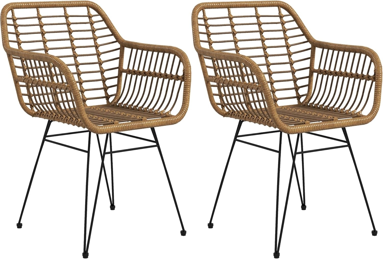Die HOMCOM Esszimmerstühle sind die perfekte Ergänzung für Ihre Küche oder Ihr Esszimmer. Dieses Set besteht aus zwei stilvollen Stühlen mit einer geschwungenen Sitzschale aus Kunstrattan, die Ihrem Raum einen natürlichen Akzent verleiht. Die bequeme Rücken- und Armlehne sorgt für entspanntes Sitzen, während die robusten Stahlbeine Stabilität und Langlebigkeit garantieren. **Highlights** - Set aus zwei Esszimmerstühlen für vielseitige Nutzung - Kunstrattan für einen natürlichen Look im Innenraum - Geneigte Rückenlehne und Armlehnen für hohen Sitzkomfort - Robuste Stahlbeine mit Pulverbeschichtung für Stabilität - Rutschfeste Fußkappen schützen den Boden und reduzieren Geräusche **Produkteigenschaften** - Farbe: Hellbraun, Schwarz - Material: Kunstrattan, Stahl - Gesamtabmessung: 56 x 60 x 79 cm - Sitzgröße: 40 x 43 cm - Sitzhöhe: 45 cm - Größe der Sitzlehne: 56 x 44 cm - Belastbarkeit: 120 kg **Lieferumfang** - 2 x Küchenstuhl - 1 x Anleitung