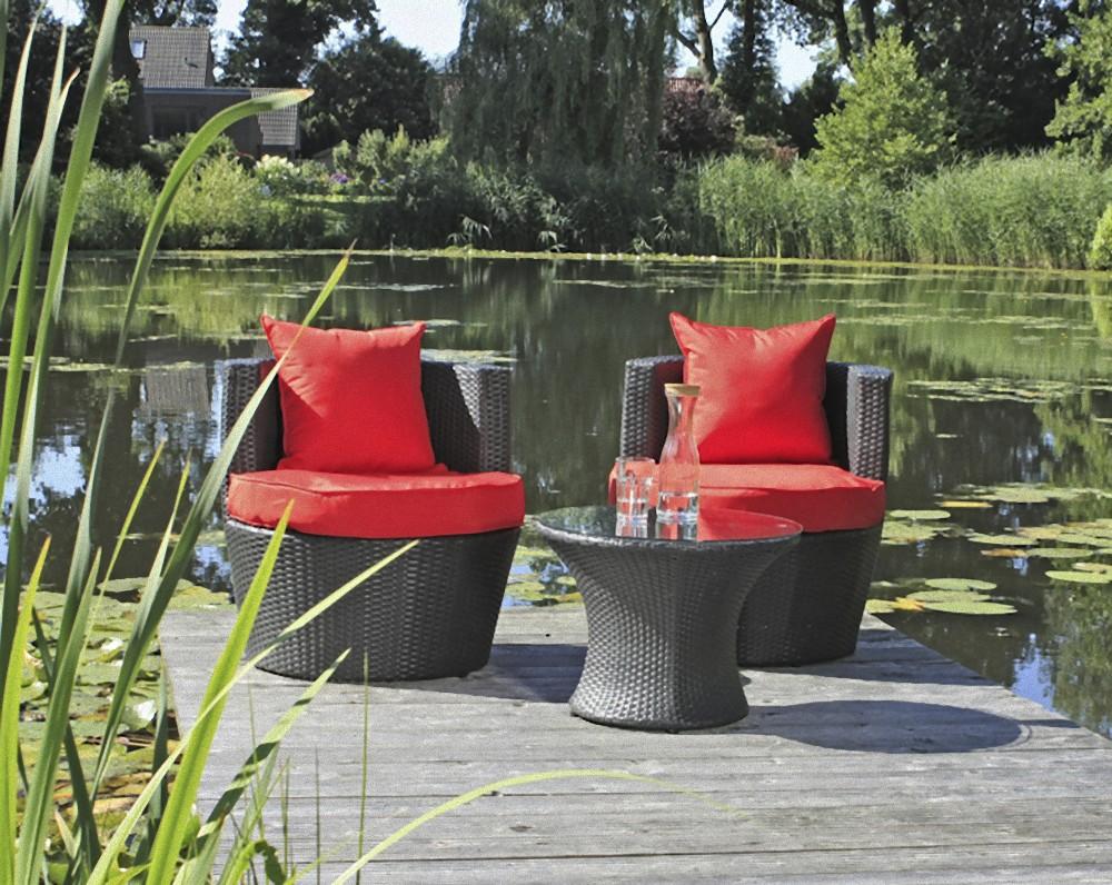 Das Club-Set LINZ vereint modernes Design mit Funktionalität. Die Sitzgruppe aus robustem Stahl und Kunststoffgeflecht in Schwarz besteht aus zwei Sesseln und einem runden Tisch. Die roten Kissen sorgen für zusätzlichen Komfort. Mit UV- und wetterbeständigen Materialien ist dieses Set ideal für den Innen- und Außenbereich. **Highlights** - Modernes Design in 4-String-Optik - UV- und wetterbeständig für den Außenbereich - Bequeme Auflagen mit Reißverschluss - Inklusive zwei roter Kissen für zusätzlichen Komfort - Platzsparend und funktionell **Produkteigenschaften** - Material: Stahl / Kunststoffgeflecht - Farbe: Schwarz - Artikelmaße Sessel: 70 x 73 x 71 cm (B x H x T) - Artikelmaße Tisch: Ø 57,5 x 43,5 cm (Ø x H) - Sitzbreite: 51 cm - Sitztiefe: 62 cm - Sitzhöhe: 45 cm mit Kissen - Auflagenstärke: 8 cm - Kissenstärke: 10 cm - Rohrstärke: 30 x 30 x 1,2 mm - Kissenbezug: 100 % Polyester - Verpackungsmaße: 78 x 78 x 132 cm **Lieferumfang** - 1 Tisch - 2 Sessel mit roten Kissen