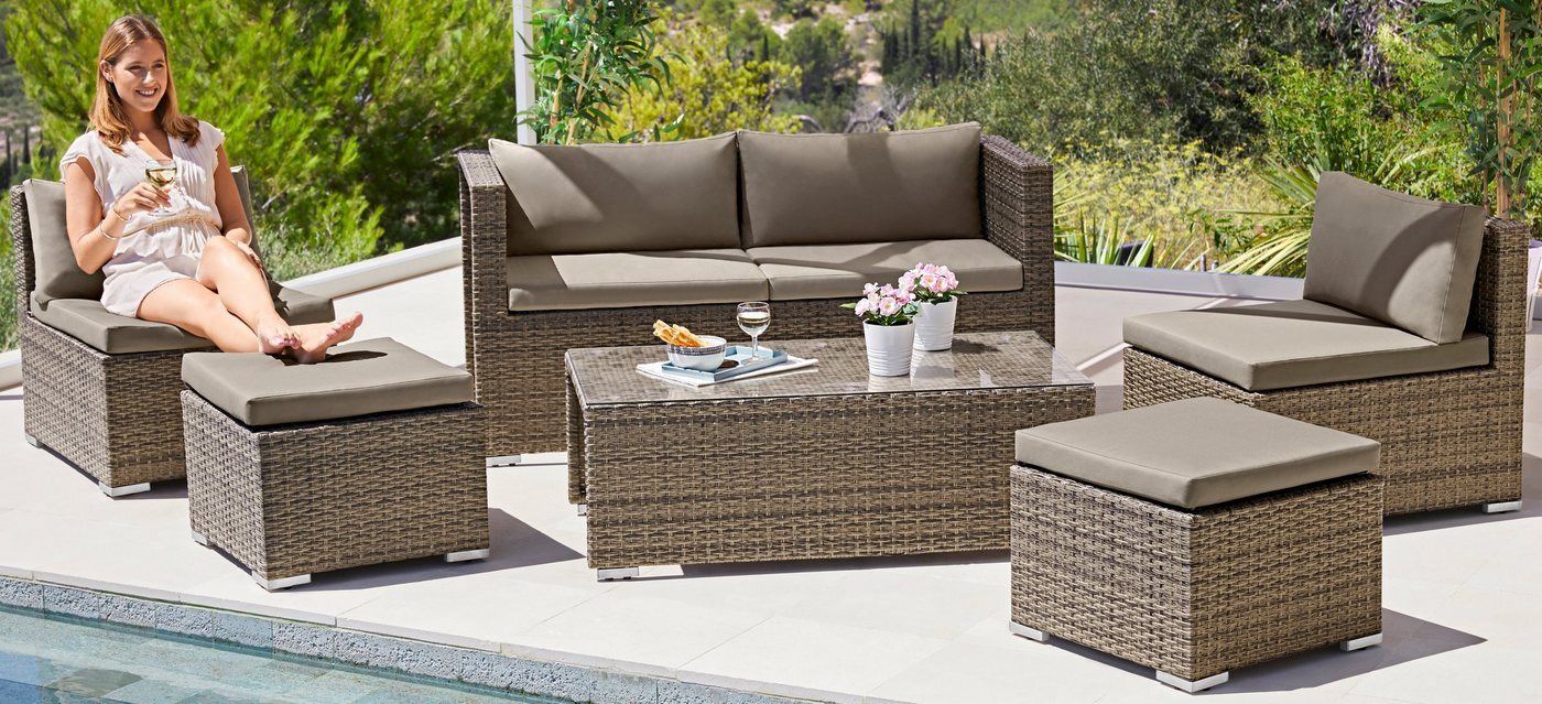 Das MERXX Gartenlounge-Set Vigo bietet Platz für bis zu sechs Personen und ist ideal für gesellige Sommerabende. Das Set besteht aus einem Zweisitzersofa und vier Hockern, die mit weich gepolsterten Sitzauflagen und Kissen ausgestattet sind. Ein langlebiges Stahlgestell sorgt für Stabilität, während die hübsche Polyrattan-Oberfläche das Design abrundet. Der rechteckige Tisch mit einer Tischplatte aus 5 mm starkem Sicherheitsglas ist ein attraktiver Mittelpunkt. Die beiden Hocker lassen sich bei Bedarf komplett unter dem Tisch verstauen. **Highlights** - Platz für bis zu sechs Personen - Weich gepolsterte Sitzauflagen und Kissen für hohen Komfort - Langlebiges Stahlgestell für Stabilität - Tischplatte aus 5 mm starkem Sicherheitsglas - Hocker können unter dem Tisch verstaut werden **Produkteigenschaften** - Set besteht aus einem Zweisitzersofa und vier Hockern - Material: Polyrattan - Rechteckiger Tisch als Mittelpunkt des Sets
