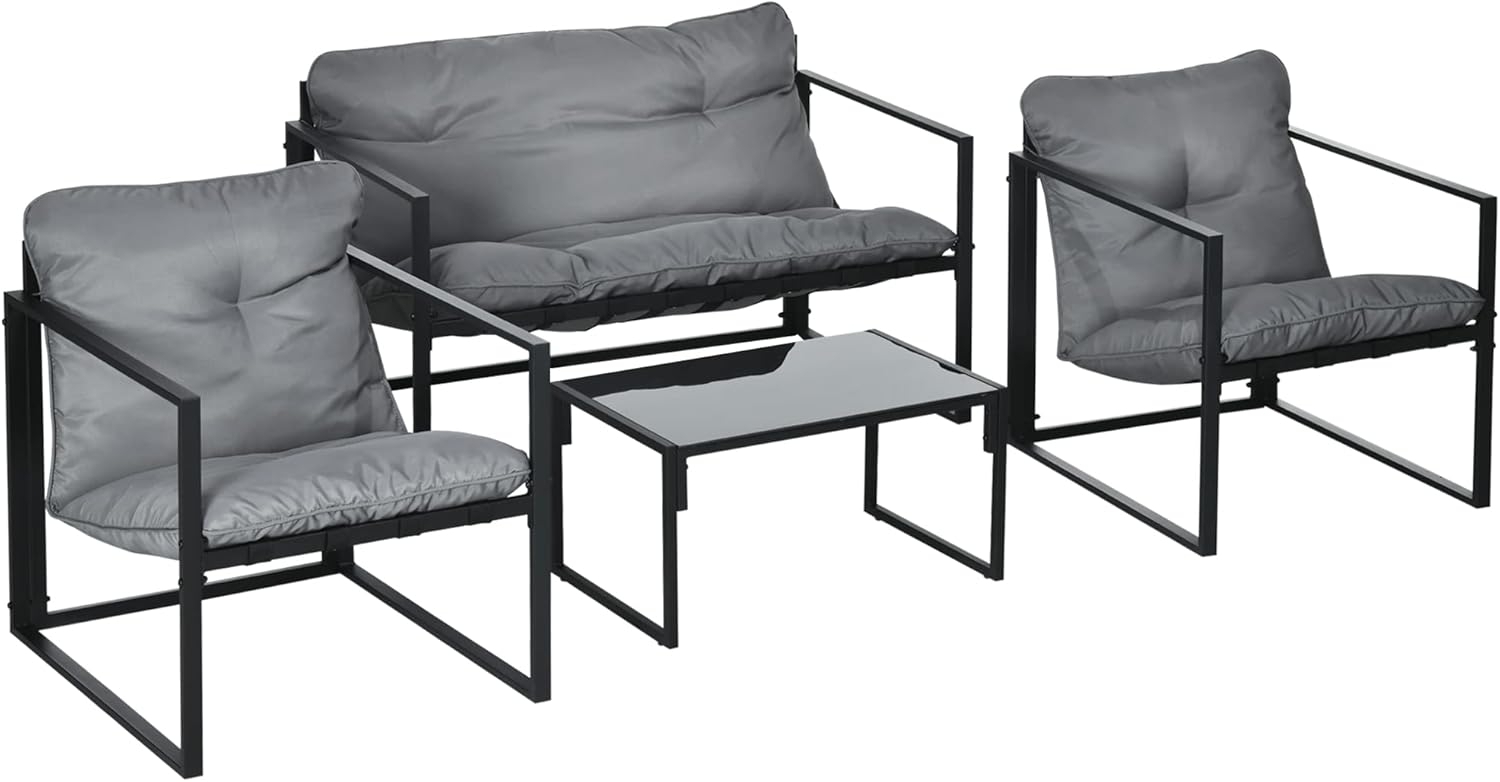 Mit dem Outsunny Sitzgruppe Gartenmöbel-Set genießen Sie gesellige Stunden im Freien. Dieses vierteilige Set umfasst zwei Sessel, ein Zweisitzer-Sofa und einen Esstisch. Die wetterbeständige Konstruktion aus pulverbeschichtetem Stahl und die dick gepolsterten Kissen sorgen für hohen Komfort. Die elegante Tischplatte aus gehärtetem Glas rundet das moderne Design ab. **Highlights** - Wetterbeständige Konstruktion für dauerhaften Einsatz im Außenbereich - Dick gepolsterte Kissen für hohen Sitzkomfort - Elegante Tischplatte aus gehärtetem Glas - Modernes Design mit geschwungenen Linien - Montage erforderlich **Produkteigenschaften** - Farbe: Grau, Schwarz - Material: Stahl, Polyester, Schaumstoff - Doppelsofa Größe: 114 x 70 x 67 cm - Sitzgröße des Doppelsofas: 108x52 cm - Sessel Größe: 60 x 70 x 67 cm - Sitzgröße: 54x52 cm - Sitzhöhe bis zum Boden: 35 cm - Tisch Größe: 65 x 42 x 35 cm - Dicke der Kissen: 15 cm - Gewichtskapazität: 120 kg (Sessel), 240 kg (Sofa), 30 kg (Tisch) **Lieferumfang** - 1 x Doppelsofa - 2 x Stühle - 1 x Tisch aus gehärtetem Glas - 3 x Sitzkissen - 1 x Anleitung