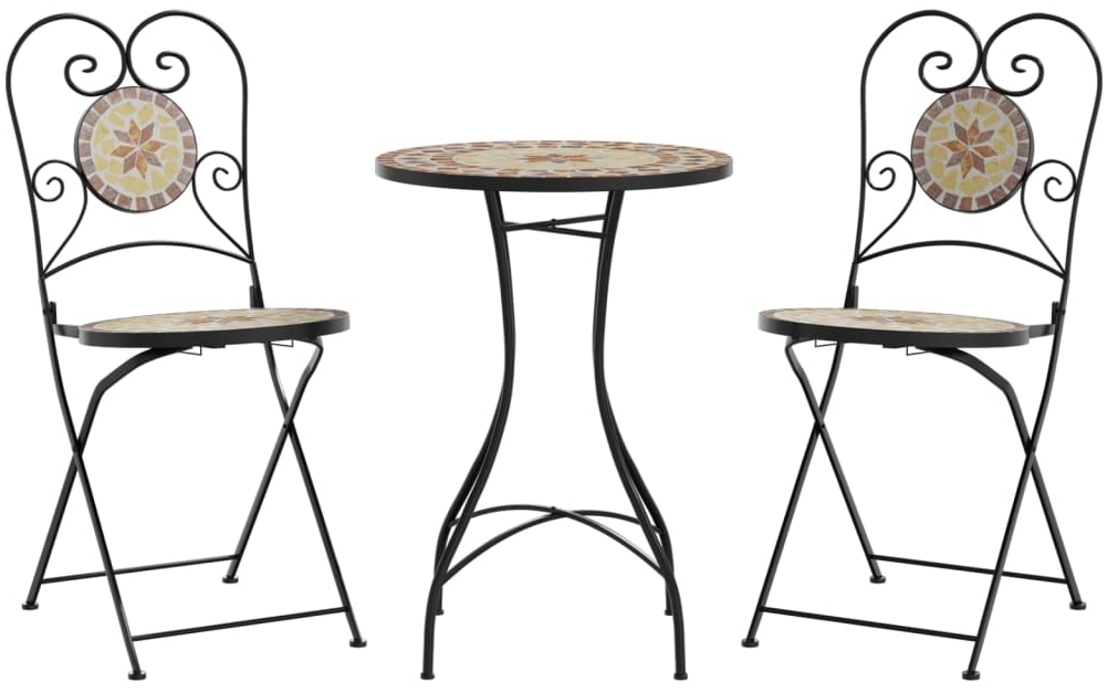 Genießen Sie entspannte Stunden im Freien mit dem vidaXL Mosaik-Bistro-Set in Terrakotta und Weiß. Dieses Set besteht aus einem stabilen Tisch mit einer pflegeleichten Keramikplatte und zwei robusten Bistrostühlen, die sich ideal für den Innen- und Außenbereich eignen. Das klappbare Design der Stühle spart Platz, während das ansprechende Mosaik-Design eine mediterrane Atmosphäre schafft. **Highlights** - Stabile und pflegeleichte Tischplatte aus Keramik - Robustes Gestell aus pulverbeschichtetem Eisen - Klappbares Design für platzsparende Aufbewahrung - Mediterranes Mosaik-Design für eine ansprechende Optik - Maximale Tragfähigkeit pro Sitz: 110 kg **Produkteigenschaften** - Tischfarbe: Terrakotta und Weiß - Tischmaterial: Gestell aus pulverbeschichtetem Eisen, Keramik - Tischabmessungen: 50 x 70 cm (Durchmesser x H) - Stuhlfarbe: Terrakotta und Weiß - Stuhlmaterial: Gestell aus pulverbeschichtetem Eisen, Keramik - Stuhlabmessungen: 38 x 45,5 x 89,5 cm (B x T x H) - Sitzdurchmesser: 36 cm - Sitzhöhe vom Boden: 46 cm - Zusammenbau erforderlich: Ja **Lieferumfang** - 1 x Tisch - 2 x Bistrostuhl