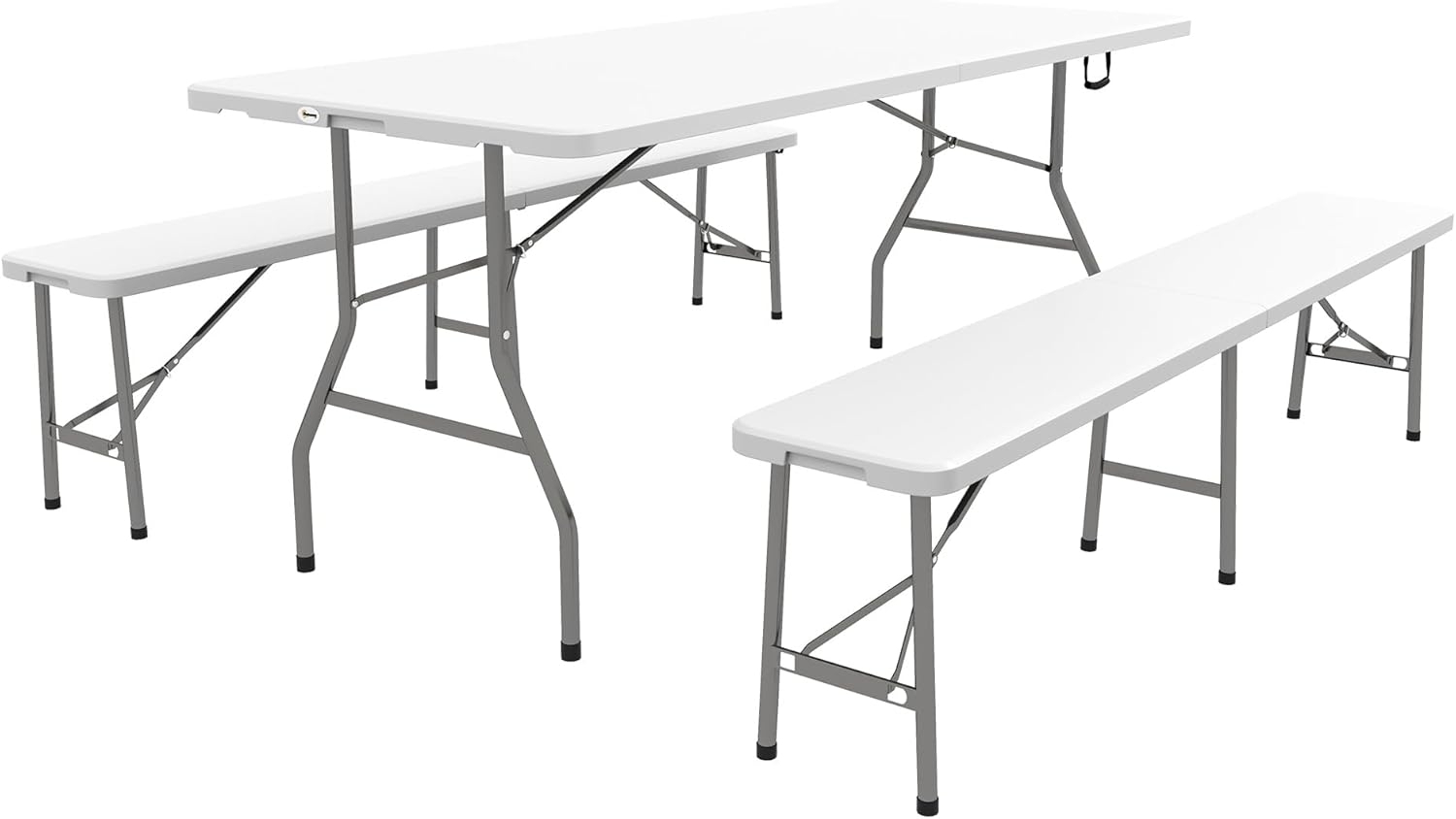 Die Outsunny Gartenbank ist eine klappbare, dreiteilige Bierzeltgarnitur, die aus einem stabilen Stahlrahmen und wasserfestem HDPE gefertigt ist. Mit einer Tragkraft von bis zu 100 kg pro Tisch und 360 kg pro Bank bietet sie Platz für bis zu sechs Personen. Ideal für Gartenpartys und Grillfeiern, lässt sich das Set schnell aufbauen und platzsparend verstauen. **Highlights** - Klappbar für schnellen Aufbau und einfache Lagerung - Wasserfestes HDPE für langlebige Nutzung - Verstärkter Stahlrahmen für maximale Stabilität - Bequeme Sitzplätze für bis zu sechs Personen - Einsatzbereit ab Auspacken **Produkteigenschaften** - Farbe: Weiß - Material: Stahl, HDPE - Tischabmessungen: 180 x 75 x 73 cm - Bankabmessungen: 183 x 30 x 43 cm - Klappgröße (Tisch): 90 x 75 x 8 cm - Klappgröße (Bank): 91,5 x 30 x 8,5 cm - Sitzgröße: 183x30 cm - Sitzhöhe: 43 cm - Tragkraft: 360 kg (Bank), 100 kg (Tisch) **Lieferumfang** - 1 x Tisch - 2 x Bank - 1 x Bedienungsanleitung