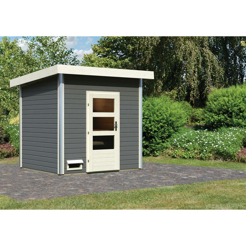 Karibu Saunahaus Norge mit moderner Tür terragrau