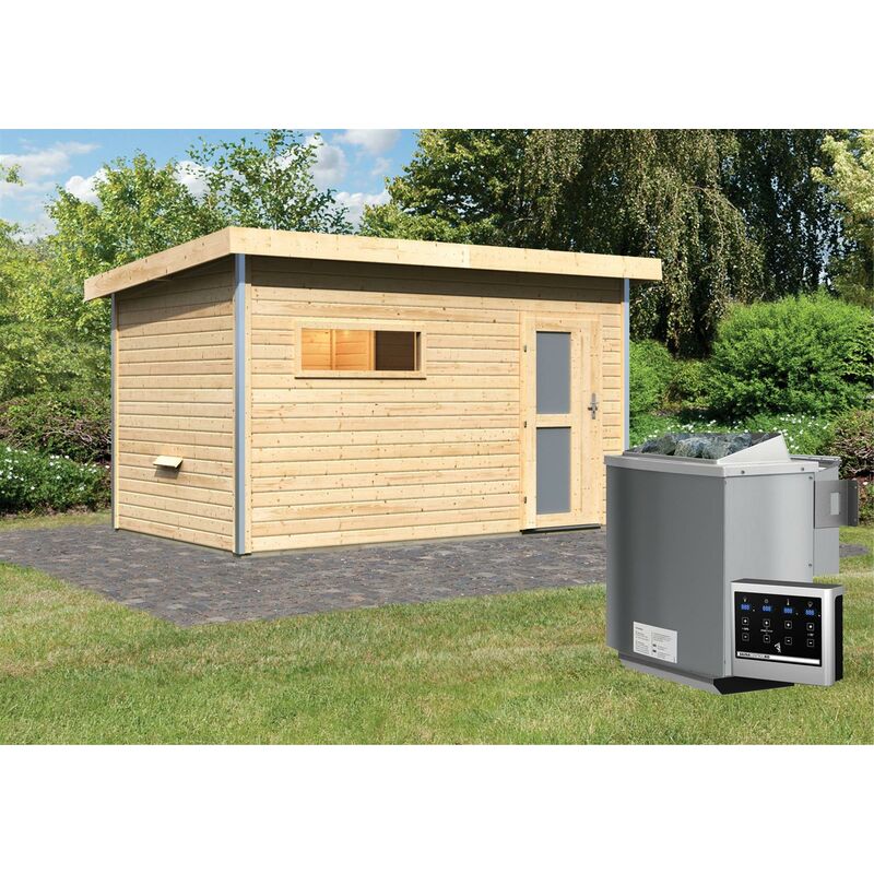 in GartensaunenKaribu Saunahaus Skrollan 3 mit Milchglastür Set Ofen 9 kW Bioexterne Steuerung easy