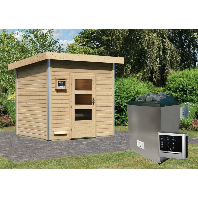 Karibu Saunahaus Skrollan 3 mit moderner Tür naturbelassen