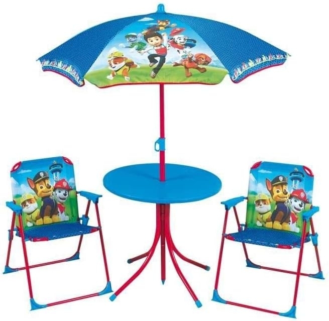 Paw Patrol Kindertisch-Set mit zwei klappbaren Stühlen und einem Sonnenschirm. Ideal für den Garten, bietet es Ihrem Kind einen gemütlichen Platz zum Entspannen. Der Sonnenschirm sorgt für Schatten, während die Stühle leicht zusammenklappbar sind und somit einfach verstaut werden können. **Highlights** - Klappbare Stühle für einfache Lagerung - Sonnenschirm für optimalen Schatten - Paw Patrol Design für große Freude bei Kindern - Robuste Bauweise für den Außenbereich - Kompaktes Set für kleine Gärten **Produkteigenschaften** - Tisch: +/- H 46 x Ø 46 cm - Stuhl: +/- 53 x 39 x 39 cm - Sonnenschirm: +/- H 125 x Ø 100 cm **Lieferumfang** - 1x Tisch - 2x Klappstühle - 1x Sonnenschirm - Keine weiteren Möbelstücke enthalten