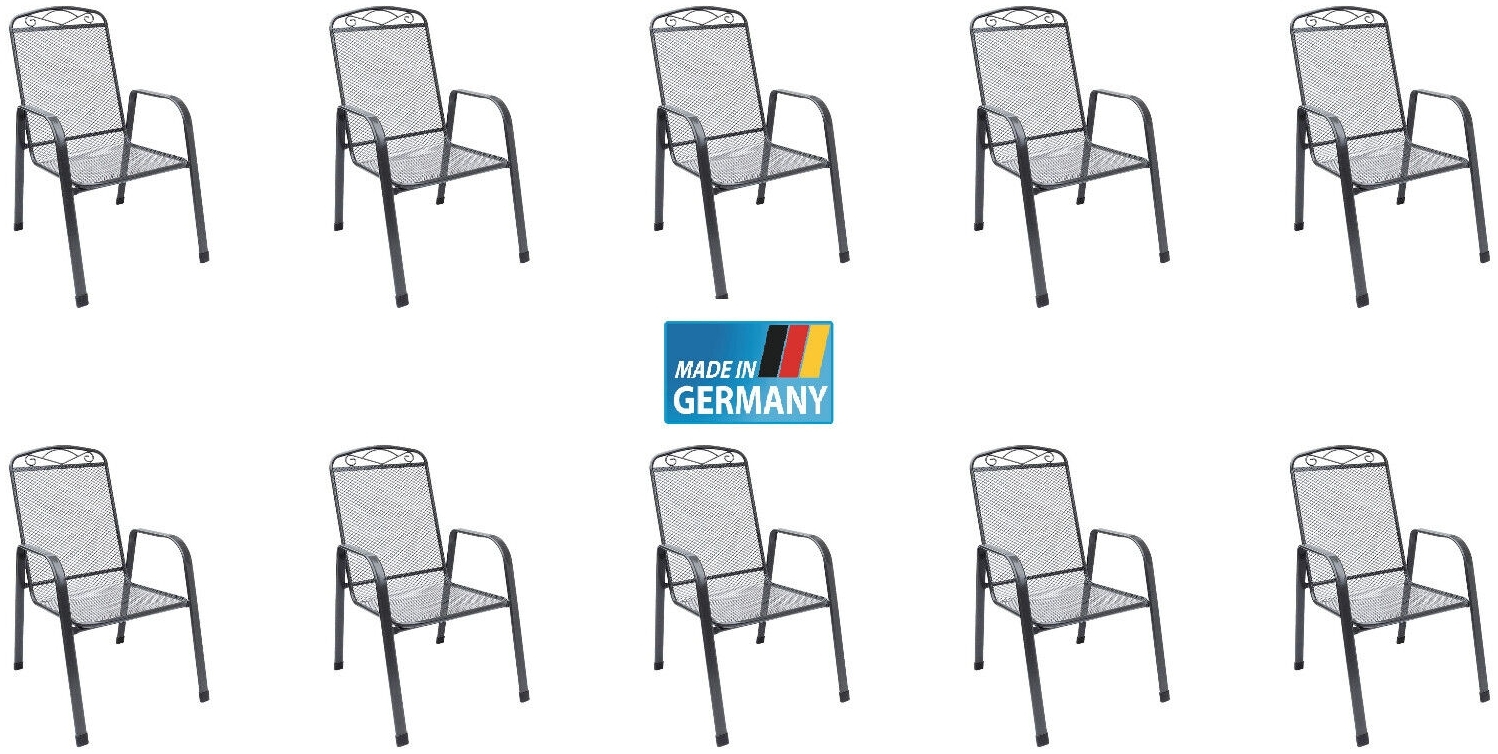 10er-Set hochwertige Stapelsessel der Firma MFG aus UV- und wetterfestem Streckmetall **Merkmale**: * 4 Stapelsessel aus wetterfestem Streckmetall mit nano Beschichtung * TÜV und GS geprüft - auch für die Gastronomie getestet * UV- und Wetter beständig in der Farbe anthrazit * leicht zu Stapeln und Verstauen **Maße**: * 59x67x98cm ( BxTxH ) * Sitzhöhe 41cm * Belastbarkeit 110kg