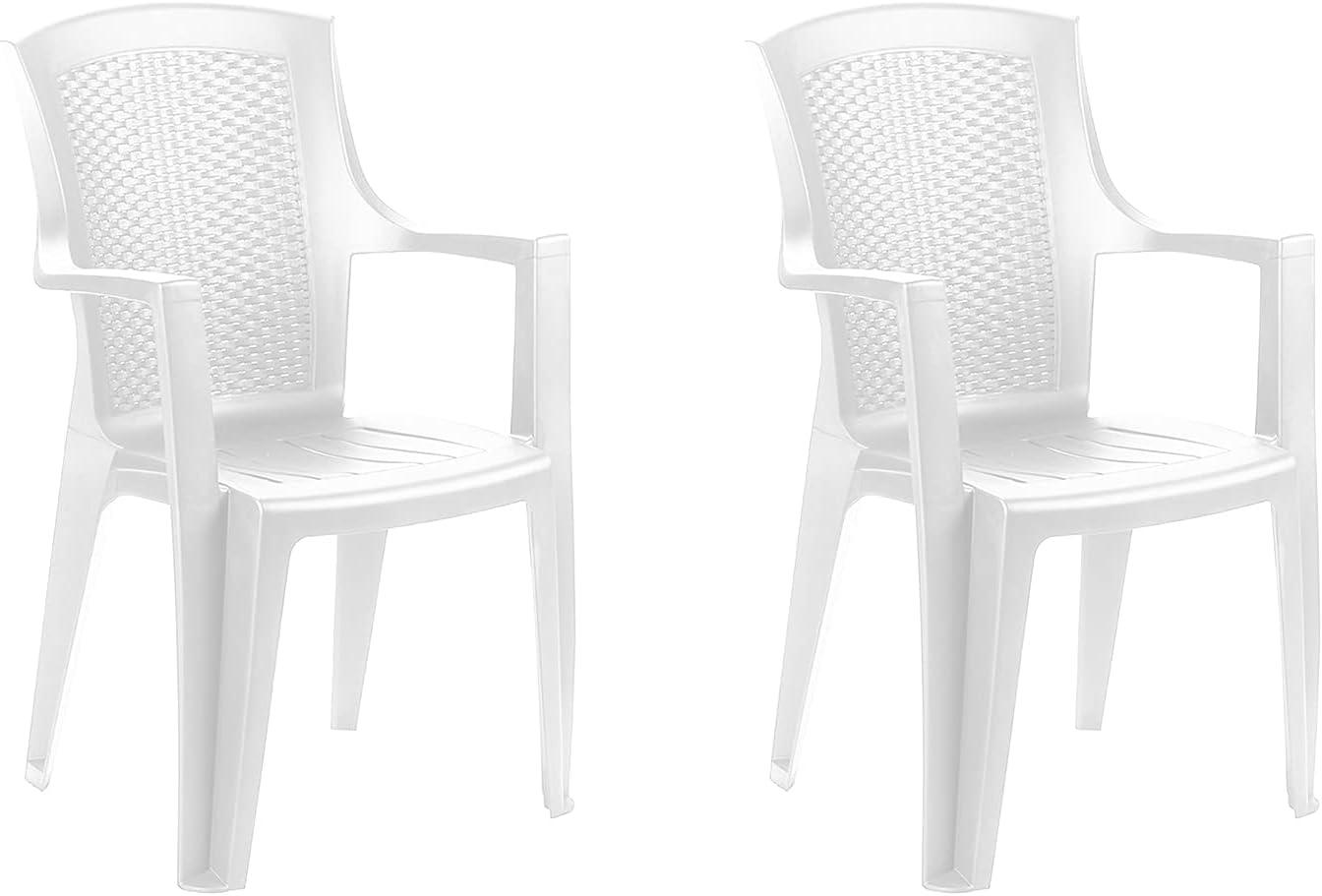 2 Stück Stapelsessel Stapelstuhl Bistrostuhl Kunststoff Eden Rattan-Optik Weiß Der 2er Set Kunststoff Stapelstuhl Eden Rattan-Optik in Weiß verbindet schlichtes Design mit Gemütlichkeit. Mit seiner schönen Rattan-Optik macht er überall eine gute Figur. Der Stuhl ist stabil und formschön. Besonders praktisch ist die Stapelfunktion, die eine platzsparende Aufbewahrung ermöglicht. Der Gartenstuhl eignet sich ideal für den Einsatz im Garten, auf der Terrasse oder dem Balkon. **Highlights** - Stapelbarer Gartenstuhl in Rattan-Optik - Stabil und formschön - Platzsparende Aufbewahrung - Geeignet für Garten, Terrasse und Balkon **Produkteigenschaften** - Material: Kunststoff - Farbe: Weiß - Stuhlgröße: ca. 92 x 57 x 62 cm (H/B/T) - Sitzhöhe: 44 cm - Sitzfläche: 42x44 cm - Gewicht: 3,5 kg **Lieferumfang** - 2 Stück Stapelstuhl / Gartenstuhl in Rattan-Optik mit Arm- und Rückenlehne