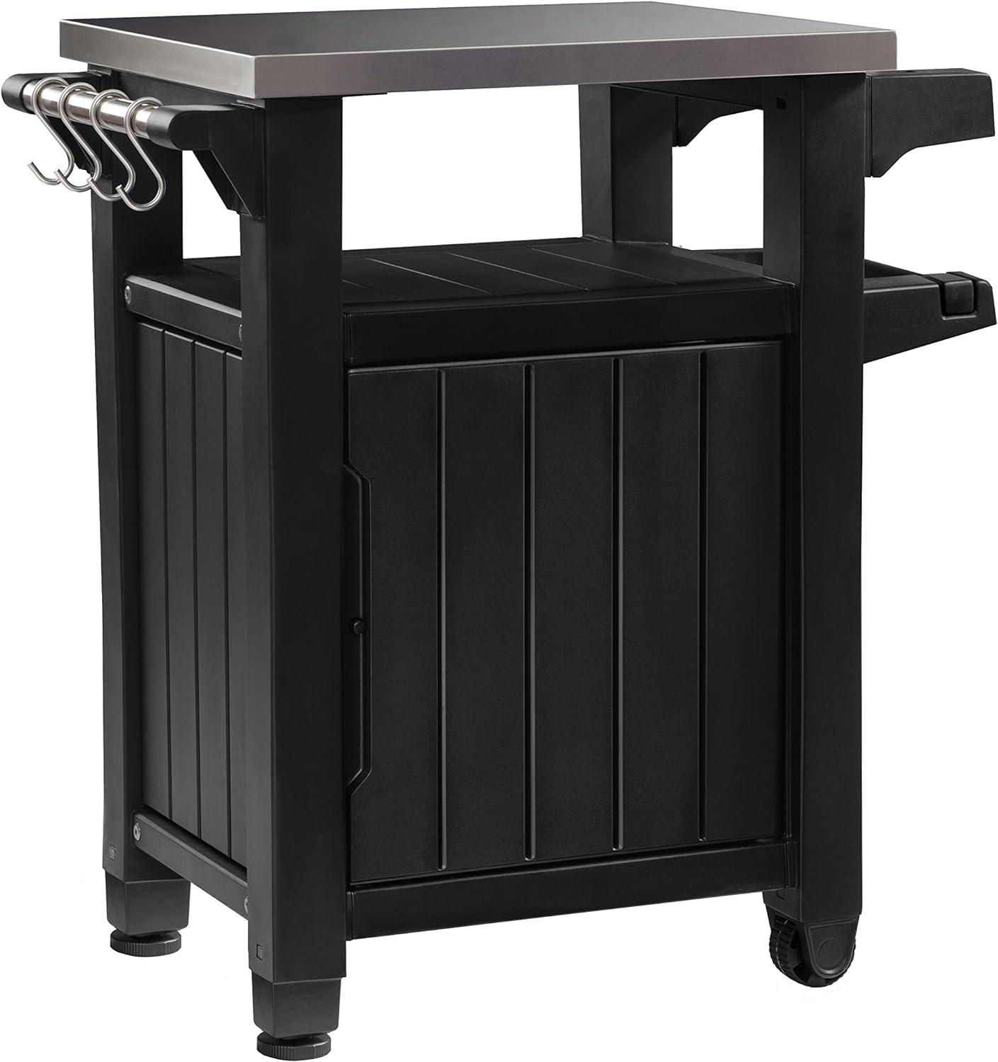 Der Keter BBQ-Tisch ist der ideale Begleiter für Ihren Grillabend. Mit einer Größe von 54 x 70 x 90 cm bietet er ausreichend Platz für Ihr Grillzubehör. Die Arbeitsfläche aus Edelstahl ermöglicht ein komfortables Arbeiten. Der Tisch verfügt über einen geschlossenen Stauraum von 93 l und insgesamt ca. 135 l Stauraum. Dank seiner wetter- und UV-Beständigkeit ist er besonders langlebig. Mit den 2 Rädern lässt er sich leicht bewegen und die Tür ermöglicht einen einfachen Zugang zum Stauraum. Der BBQ-Tisch ist in der Farbe graphit/anthrazit erhältlich und wird inklusive Besteckhaken und Küchenrollenhalter geliefert. **Highlights** - Arbeitsfläche aus Edelstahl für komfortables Arbeiten - Geschlossener Stauraum von 93 l und insgesamt ca. 135 l Stauraum - Wetter- und UV-beständig für eine lange Lebensdauer - 2 Räder für einfache Mobilität - Inklusive Besteckhaken und Küchenrollenhalter **Produkteigenschaften** - Maße: 54 x 70 x 90 cm (L x B x H) - Material: Polypropylen - Farbe: graphit/anthrazit **Lieferumfang** - Keter BBQ-Tisch - Besteckhaken - Küchenrollenhalter