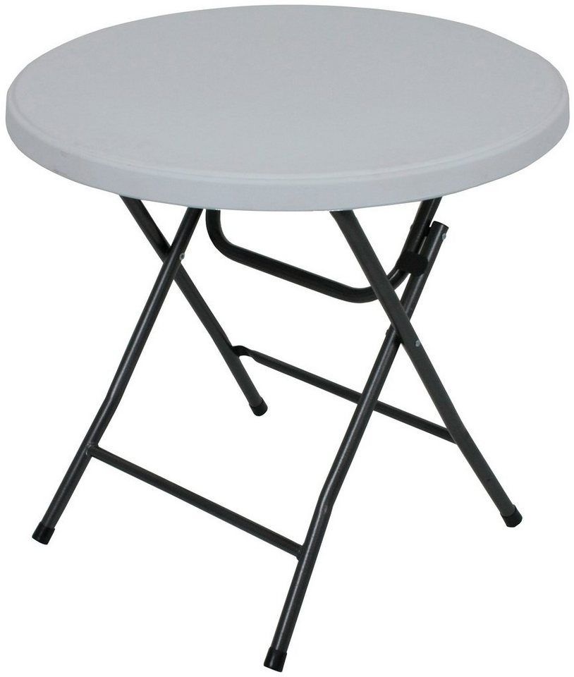 Beschreibung Tisch MUFARO, Ø80cm Details • Tisch MUFARO • Ø80cm • Material Stahl • Kunststoff • Stahl / Kunststoff HDPE • weiß • Artikelmaße Ø80xH73,5 cm • Artikelmaße2 Maß geklappt 103x81x4,5cm • Artikelmaße3 Stahlrohr: Ø25x1mm • Sitzbreite und -tiefe • Sitzhöhe • Zusatzinformation Max. Belastung: 80kg • Verpackungsmaße L106xB82xH6 cm