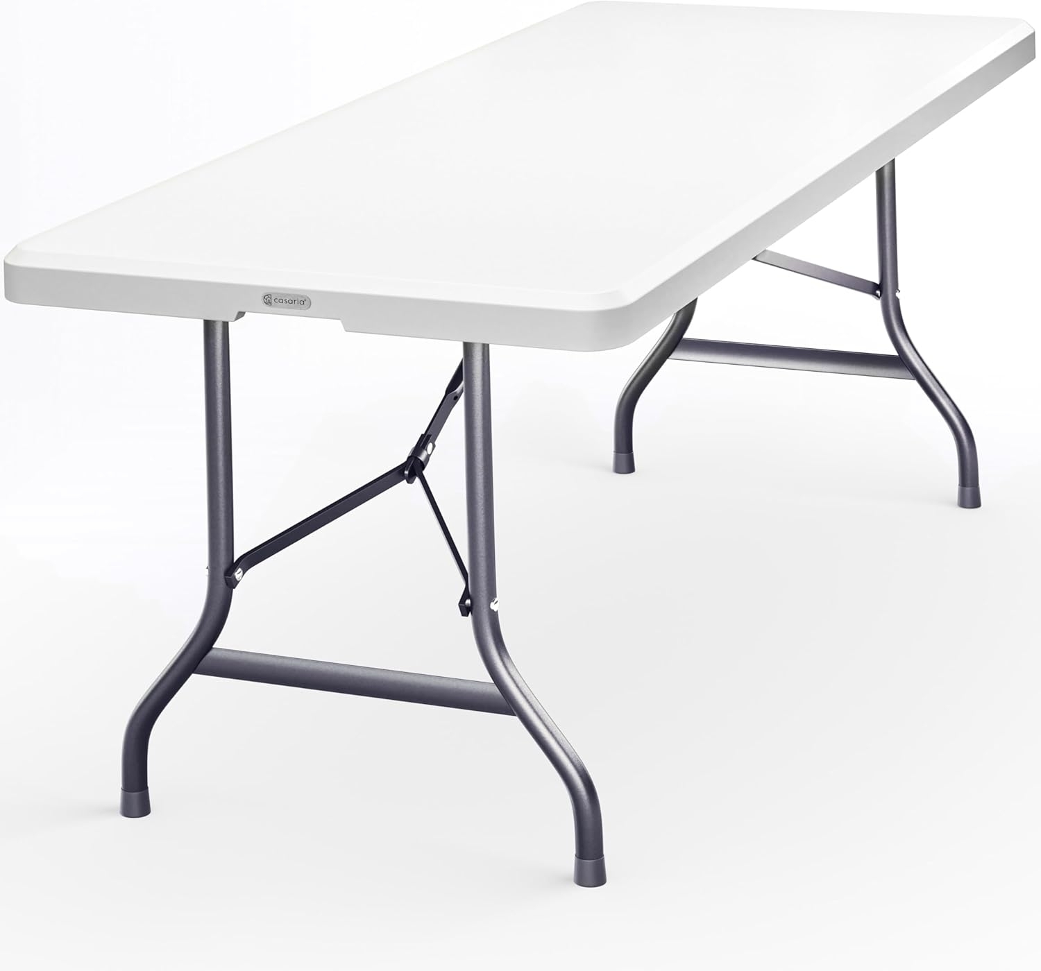 Der Casaria XL Klapptisch ist ein praktischer Begleiter für den Garten, Campingausflüge und vieles mehr. Mit einer extra breiten und langen Tischplatte bietet er Platz für bis zu 10 Personen. Der Tisch lässt sich schnell und einfach aufbauen und ist mit einem Tragegriff ausgestattet, sodass er leicht zu transportieren ist. Dank seines geringen Packmaßes lässt er sich platzsparend verstauen. Der Tisch ist aus witterungsbeständigem HDPE Kunststoff und einem robusten Stahlgestell gefertigt, was ihn ideal für den Außenbereich macht. Die glatte Oberfläche aus Kunststoff ist leicht zu reinigen. Mit Anti-Rutsch-Füßen steht der Tisch sicher und schont empfindliche Untergründe. Der Casaria XL Klapptisch ist stabil, standfest und für den Innen- und Außenbereich geeignet. **Highlights** - Extra breite (70 cm) und lange Tischplatte (220 cm) für bis zu 10 Personen - Klappbar und mit Tragegriff für einfaches Transportieren und Verstauen - Geringes Tragegewicht und kofferraumfreundliches Packmaß - Anti-Rutsch-Füße für sicheren Stand und Schutz empfindlicher Untergründe - Stabil, standfest und leicht zu reinigen **Produkteigenschaften** - Maße (LxBxH): 220 x 70 x 72 cm - Maße geklappt (LxBxH): 110 x 70 x 8 cm - Material: Kunststoff - Material Gestell: Metall - Gewicht: 14 kg - Farbe: Weiß **Lieferumfang** - Klapptisch 220 cm mit Tragegriff - Aufbauanleitung
