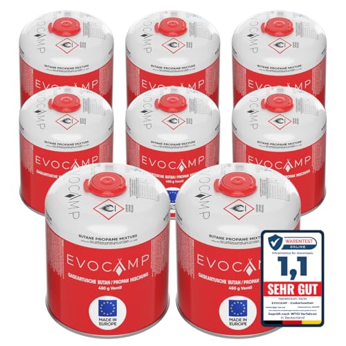 - Die EVOCAMP Gaskartuschen haben eine Füllmenge von 450 g und bestehen aus einer Mischung von 80% Butan und 20% Propan, die sowohl für kalte als auch warme Wetterbedingungen geeignet ist