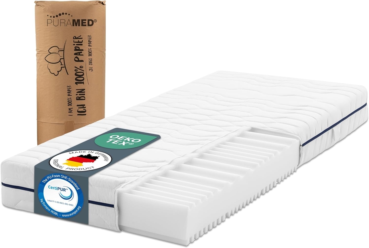 | Name | PURAMED Kaltschaummatratze - 160x200 cm - Höhe 16 cm - Härtegrad H2 & H3 - ergonomische 7-Zonen Matratze - produziert in Deutschland - waschbarer Mikrofaser-Bezug - Oeko-TEX® & CertiPUR Zertifiziert |