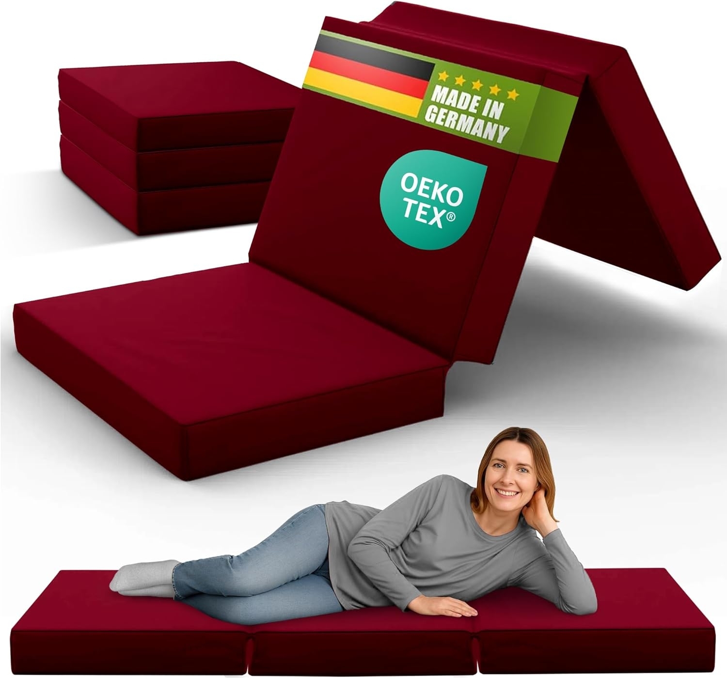 Beschreibung Die SHOGAZI Klappmatratze 90 x 200 x 12 cm bietet Ihnen eine flexible Schlaflösung für verschiedene Einsatzmöglichkeiten. Ob als Gästematratze, Reisematratze oder Bodenmatratze – sie überzeugt durch ihr klappbares Design und geringes Gewicht, was den Transport und die Lagerung erleichtert. Der hochwertige Kaltschaumkern sorgt für hervorragenden Liegekomfort und ist sowohl für Erwachsene als auch für Kinder geeignet. **Highlights** - Flexibel einsetzbar als Gästematratze, Reisematratze, Bodenmatratze oder Schlafwürfel - Gesunder und erholsamer Schlaf dank ökologischer Herstellung - Robust und für Erwachsene und Kinder geeignet - Überragende Liegeeigenschaften mit Komforthöhe von 12 cm und punktelastischem Kaltschaumkern - Vielfältig nutzbar für Camping, Caravan oder Zelten **Produkteigenschaften** - Abmessungen: 90 x 200 x 12 cm - Made in Germany - Klappbar und platzsparend zu verstauen - Tragfähigkeit bis 120 kg - Hochwertiger Kaltschaumkern mit mindestens 40 kg/m³ - Bezug aus 100% Baumwolle, waschbar bei 40°C
