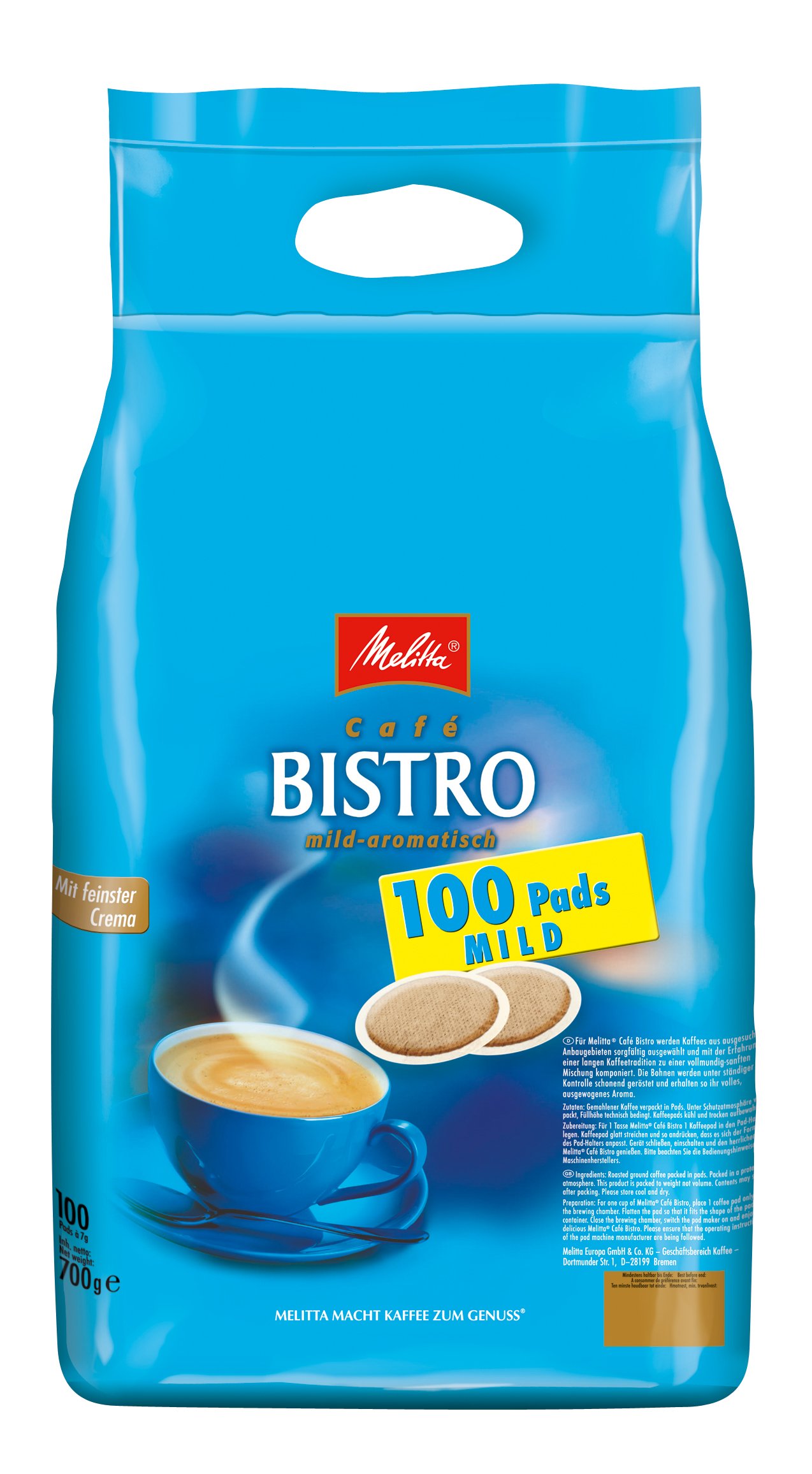 Melitta Gemahlener Röstkaffee in Kaffeepads100 Pads, mit feinster Crema, mild-aromatisch, Melitta Bistro mild, 100er Beutel, 700g